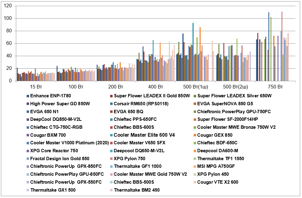 | Super Flower Leadex Silver 650W | 10,9 | 15,1 | 22,8 | 45 | 62,5 | 59,2 | |