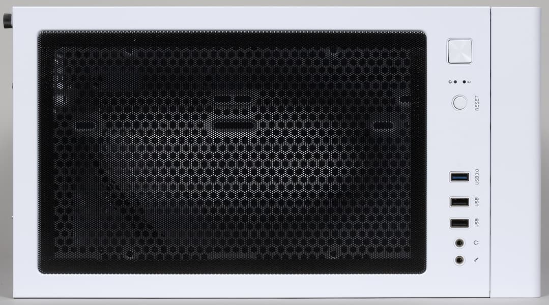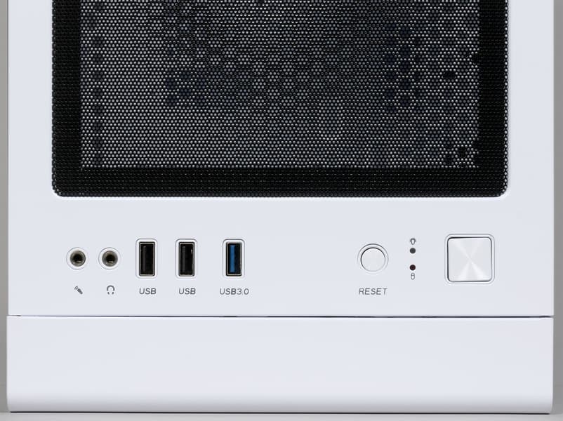 В передней части корпуса на верхней стенке размещены органы управления и коммутации: порт USB 3.0, два порта USB 2.0, стандартные разъемы для подключения микрофона и наушников, кнопка включения и кнопка перезагрузки.