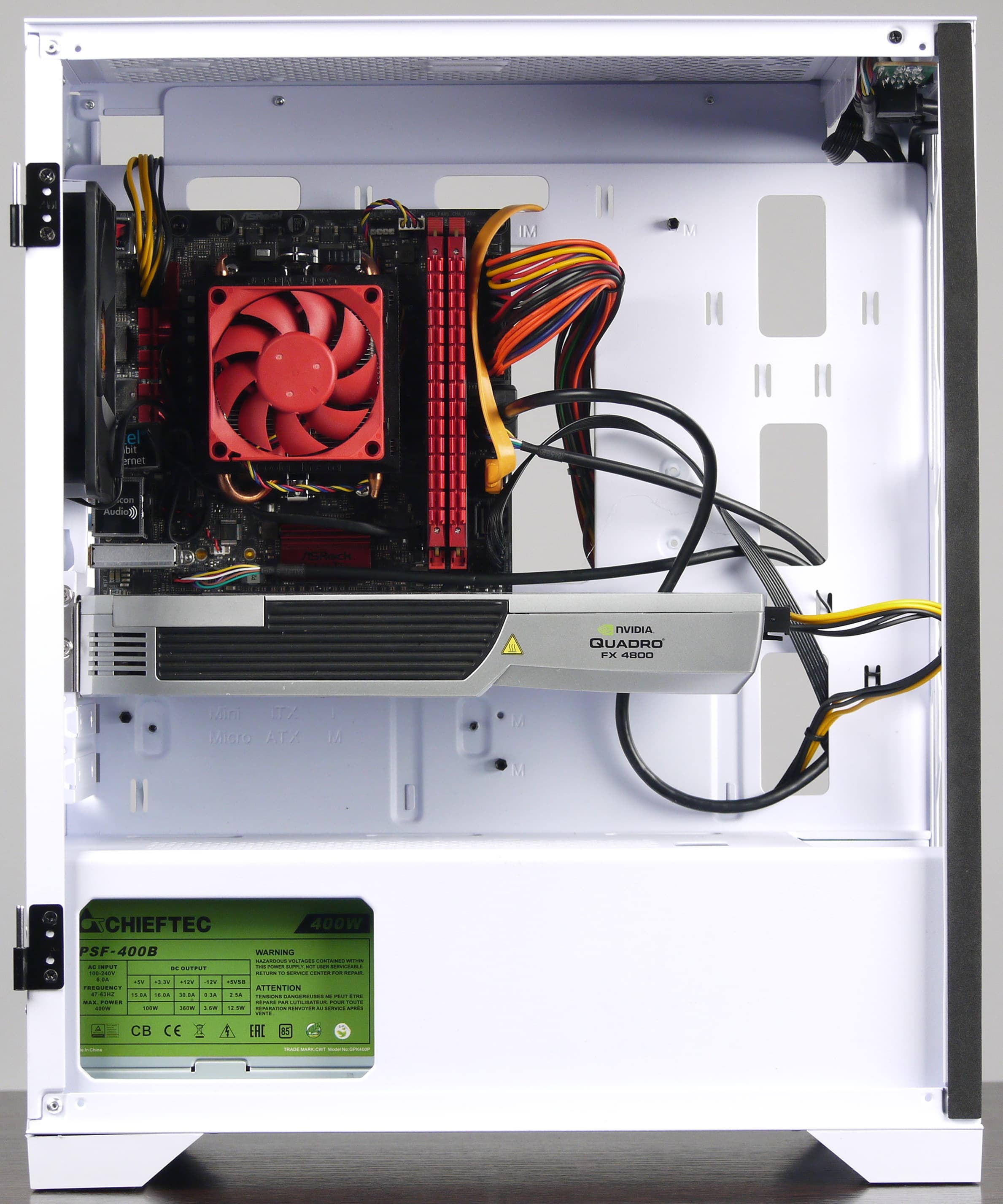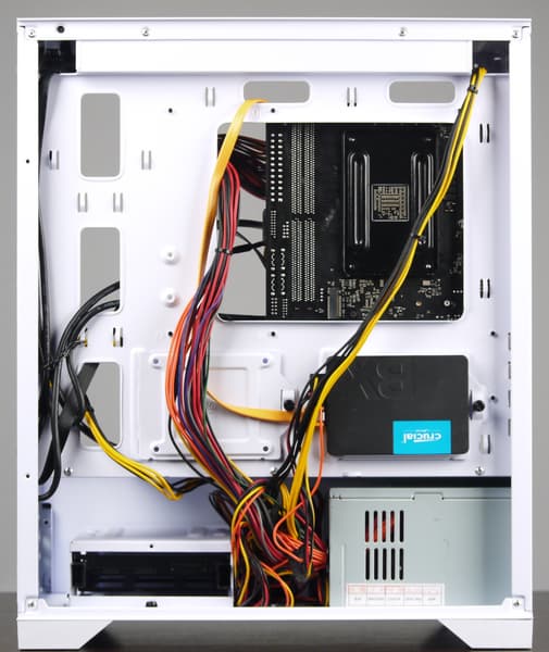 Порядок сборки ПК в данном корпусе особого значения не имеет, так как компоненты разнесены и не мешают друг другу, но лучше начать с установки блока питания и прокладки проводов. Сразу стоит отметить, что провода с оплеткой черного цвета не очень аккуратно смотрятся в полностью белом изнутри корпусе, но это типичная особенность белых корпусов.