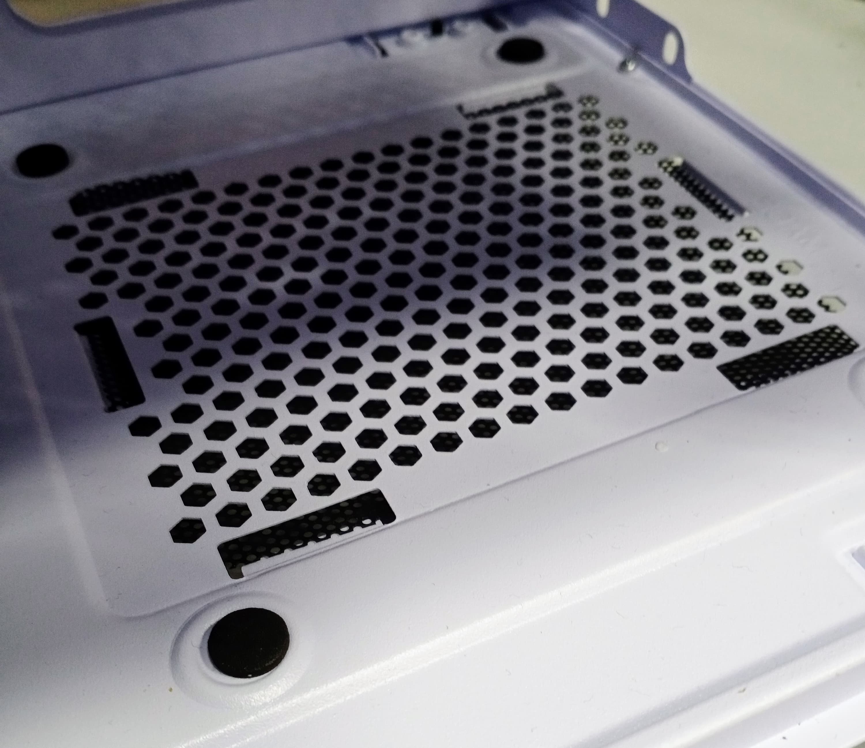 Фильтр под блоком питания выполнен из крупноячеистой сетки, которая представляет собой проштампованный лист пластика с круглыми отверстиями. Рамки он не имеет. И если снять его на ощупь еще как-то можно, то поставить обратно уже затруднительно.