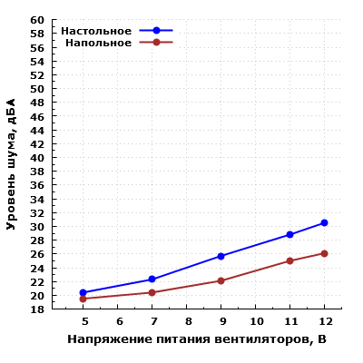 При большем удалении корпуса от пользователя и размещении его, к примеру, на полу под столом шум можно будет охарактеризовать как минимально заметный при питании вентилятора от 5 В, а при питании от 12 В — как пониженный для жилого помещения в дневное время суток.