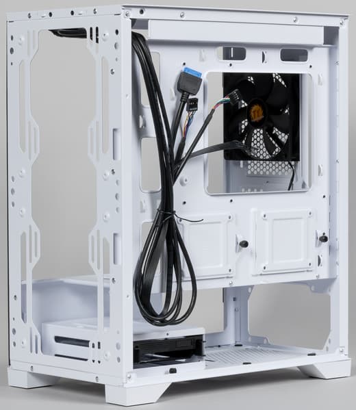 Глубина отсека для прокладки проводов составляет около 20 мм у задней стенки. Это не так уж много, но для бюджетных корпусов вполне типично. Блок питания лучше приобретать с ленточными проводами, так как их прокладка удобнее в случае малого пространства по сравнению с традиционными шнурами в нейлоновой оплетке. Для монтажа проводов предусмотрены петли для крепления стяжек или других аналогичных изделий.