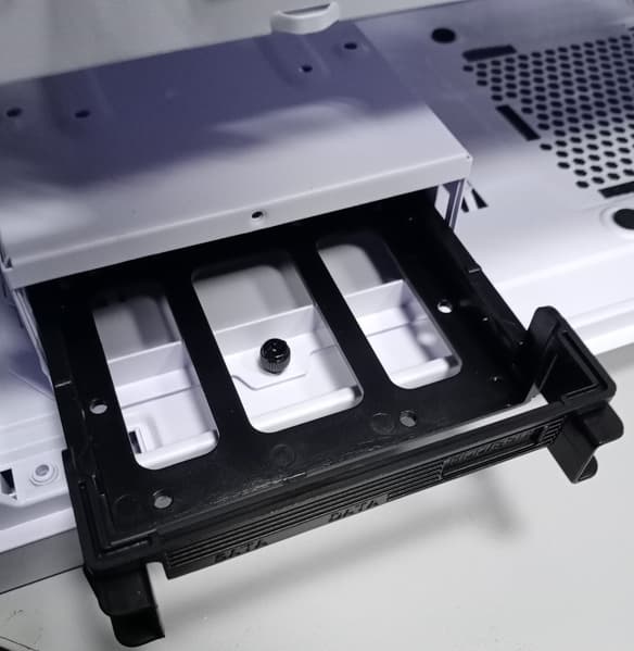 Еще один накопитель можно установить в корзину через пластиковую рамку. Диск крепится к ней с помощью винтов.