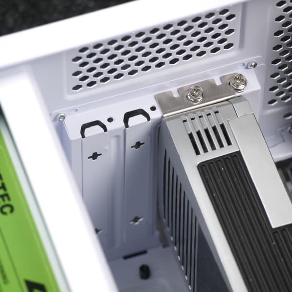 Далее можно установить требуемые платы расширения, например видеокарту, которая может достигать в длину около 330 мм, если объем корпуса между системной платой и передней стенкой шасси ничем не занят (таково расстояние между бортами шасси с внутренней стороны). Заявленная производителем длина видеокарты составляет как раз 330 мм. Система фиксации карт расширения самая обычная — крепление на винтах изнутри корпуса с индивидуальной фиксацией.