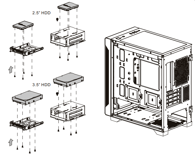 Полноразмерные жесткие диски устанавливаются в предназначенную для них корзину. Корзина в данном случае смонтирована при помощи винтового крепления, при желании ее можно снять. На верхнее посадочное место можно установить накопитель формата 3,5 или 2,5 дюйма на выбор. Фиксируется накопитель при помощи винтов.