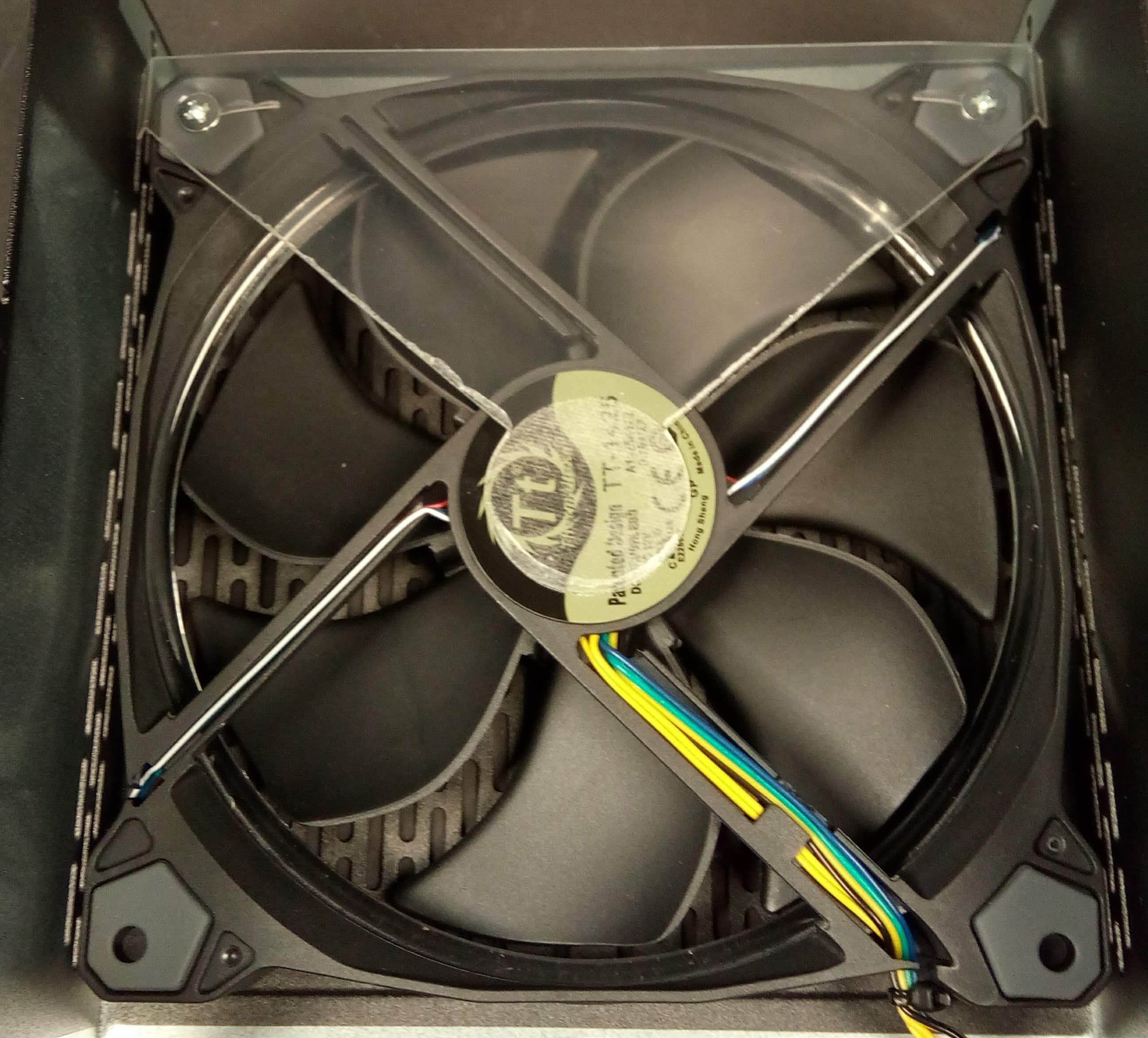 В блоке питания установлен вентилятор Riing 14 RGB, он брендирован компанией Thermaltake, однако на нем имеется и маркировка завода-изготовителя. В данном случае перед нами продукт производства компании Hong Sheng. Thermaltake заявляет об использовании гидродинамического подшипника в вентиляторе данного источника питания. У вентилятора есть 256-цветная подсветка, управляемая кнопкой на внешней панели.