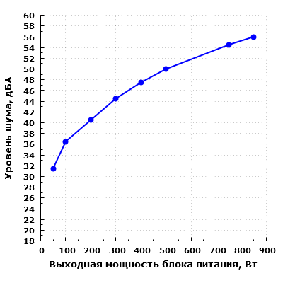 Дальнейшее повышение мощности нагрузки приводит к заметному увеличению уровня шума блока питания. При работе на мощности 500 Вт шум очень высокий не только для жилого, но и для офисного помещения. На максимальной мощности уровень шума БП достигает 56 дБА.