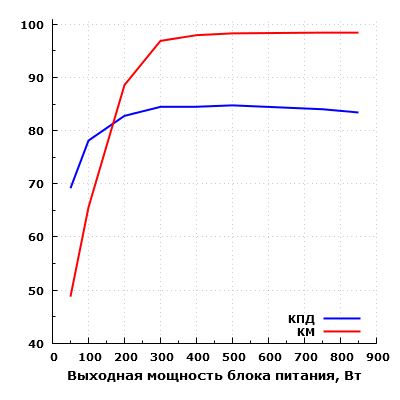 Эффективность БП находится на относительно невысоком уровне. Согласно нашим измерениям, КПД данного блока питания достигает значения свыше 84% в диапазоне мощности от 300 до 750 ватт, максимальное зарегистрированное значение составило 84,8% на мощности 500 Вт. КПД на мощности 50 Вт составил около 69%.