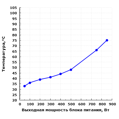 Все основные тесты проводились в режиме с постоянно вращающимся вентилятором. В данном случае при нагрузке до 500 Вт включительно термонагруженность можно считать невысокой, а вот от 750 Вт термонагруженность уже заметно выше — ее можно считать лишь удовлетворительной.