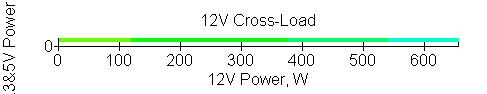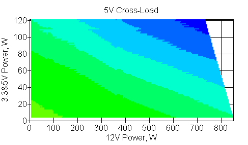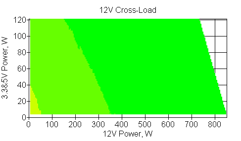 Следующим этапом инструментального тестирования является построение кросснагрузочной характеристики (КНХ) и представление ее на четвертьплоскости, ограниченной максимальной мощностью по шине 3,3&5 В с одной стороны (по оси ординат) и максимальной мощностью по шине 12 В с другой (по оси абсцисс). В каждой точке измеренное значение напряжения обозначается цветовым маркером в зависимости от отклонения от номинального значения.КНХ позволяет нам определить, какой уровень нагрузки можно считать допустимым, особенно по каналу +12VDC, для тестируемого экземпляра. В данном случае отклонения действующих значений напряжения от номинала по каналу +12VDC не превышают двух процентов во всем диапазоне мощности, что является хорошим результатом.