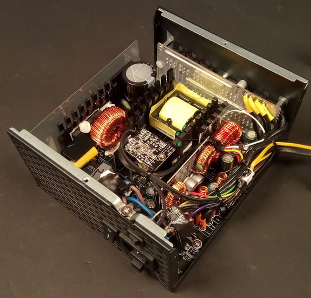 Основные полупроводниковые элементы установлены на трех компактных радиаторах с небольшим оребрением. Независимые источники +3.3VDC и 5VDC установлены на дочерней печатной плате и, по традиции, дополнительных теплоотводов не имеют — это вполне типично для блоков питания с активным охлаждением. В блоке питания установлены конденсаторы преимущественно марки Teapo, за исключением входного высоковольтного конденсатора производства Rubycon. Также установлено некоторое количество полимерных конденсаторов — в основном на плате преобразователя DC/DC.