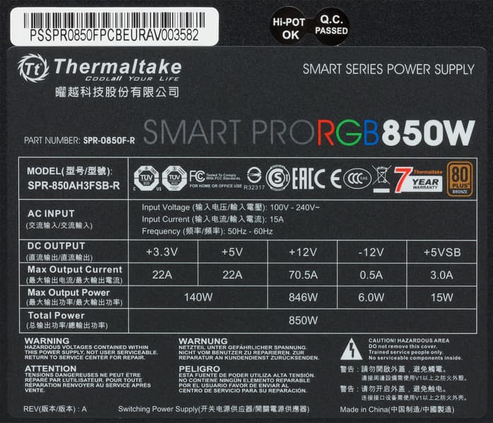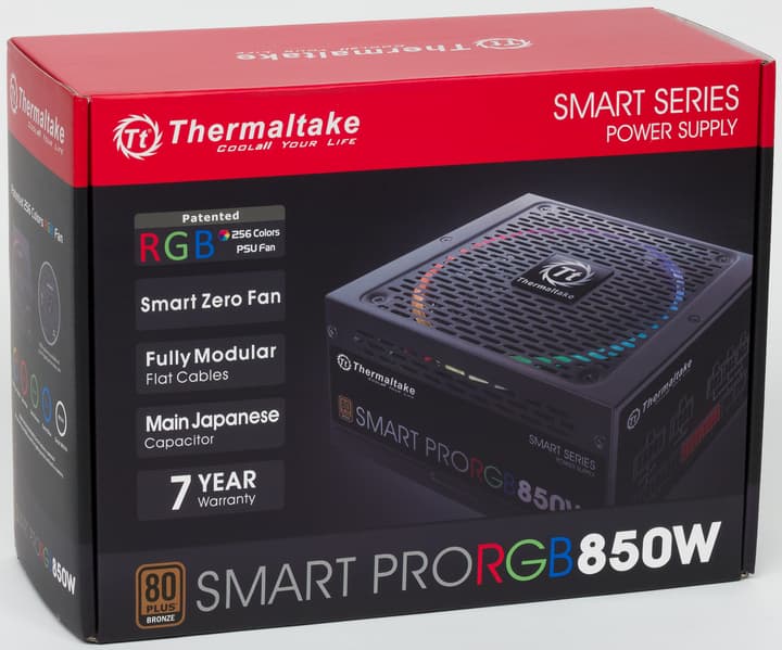 Сегодня нам предстоит познакомиться с очередным продуктом из серии Smart, который на этот раз представляет семейство Smart Pro RGB. Всего в нем три модели мощностью 650, 750 и 850 Вт, так что наш сегодняшний боец Thermaltake Smart Pro RGB 850W Bronze является старшим представителем этого семейства. Внешне данный БП очень похож на недавно протестированный Thermaltake Toughpower iRGB Plus 850W Platinum, что неудивительно, поскольку большинство последних моделей блоков питания Thermaltake имеют похожий корпус со штампованной решеткой с невысокой рабочей площадью. Их внешняя схожесть не добавляет удобства при навигации по модельному ряду, но еще хуже, что зачастую похожи и названия разных семейств. Например, Smart Pro RGB и Smart RGB: разница в одно слово, однако эти блоки питания нацелены в разные сегменты рынка и не имеют ничего общего, кроме формального отнесения к серии Smart.