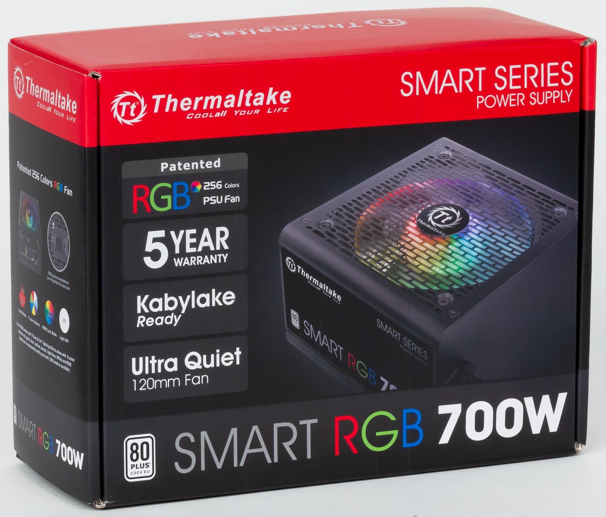 Сейчас довольно много различных продуктов из сферы компьютерных комплектующих обзаводятся модной аббревиатурой RGB в своем названии. Не устояла в стороне от этого веяния и компания Thermaltake, решения которой мы тестировали не раз. Очередным продуктом в стиле RGB, с которым мы познакомимся, станет бюджетный блок питания компании Thermaltake, имеющий название Smart RGB 700W (SPR-0700NHSAW). Это старшая модель из группы БП Smart RGB, еще в ней есть источники питания мощностью 500 и 600 Вт. Также не стоит путать эту группу с блоками питания с похожими названиями: iRGB и Smart Pro RGB.