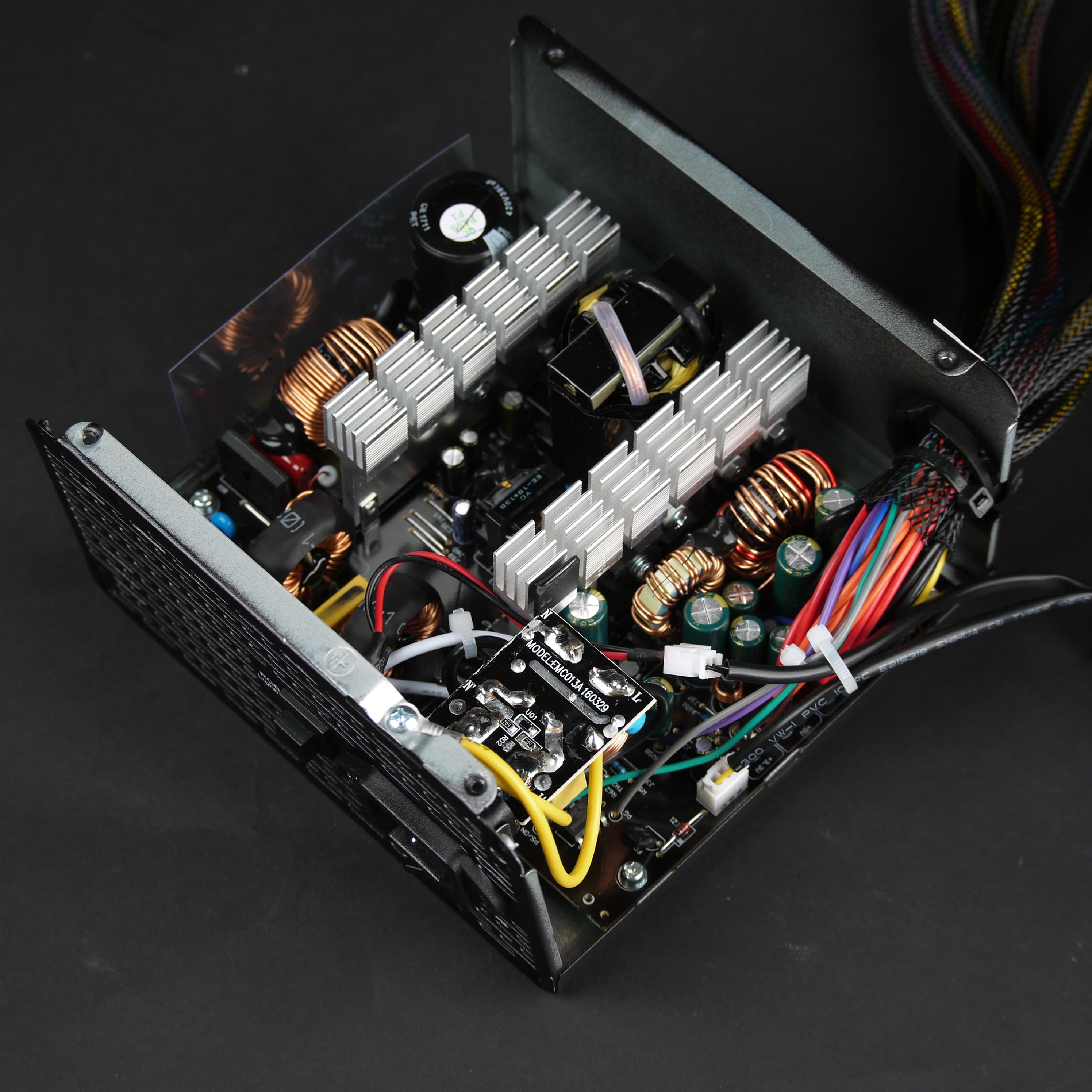 Основные полупроводниковые элементы установлены на двух радиаторах среднего размера с оребрением. Конструкция БП вполне стандартна для бюджетных решений: используется схема групповой стабилизации для каналов +12VDC и +5VDC, а также индивидуальный стабилизатор для канала +3.3VDC в выходном каскаде. Присутствует вполне полноценный сетевой фильтр на основной плате, включающий варистор и предохранитель. Также имеется фильтр коммутационных помех, собранный на сетевом разъеме. Блок питания оснащен активным корректором коэффициента мощности. Источник питания рассчитан на работу в электросетях с номинальным напряжением 230 вольт, то есть имеет стандартный, а не расширенный диапазон питающих напряжений.