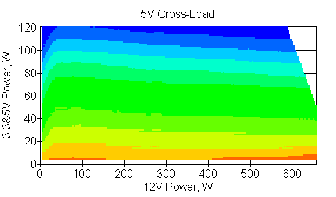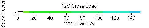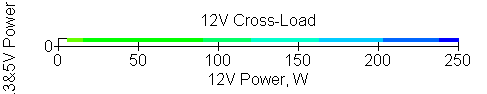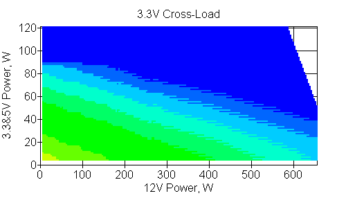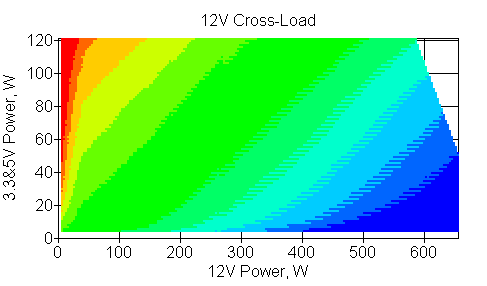 Следующим этапом инструментального тестирования является построение кросснагрузочной характеристики (КНХ) и представление ее на четвертьплоскости, ограниченной максимальной мощностью по шине 3,3&5 В с одной стороны (по оси ординат) и максимальной мощностью по шине 12 В с другой (по оси абсцисс). В каждой точке измеренное значение напряжения обозначается цветовым маркером в зависимости от отклонения от номинального значения.