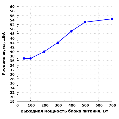 При работе на мощности 200 Вт шум блока питания достигает значения 40 дБА, которое можно считать граничным для комфортного использования оборудования в жилом помещении в дневное время суток.