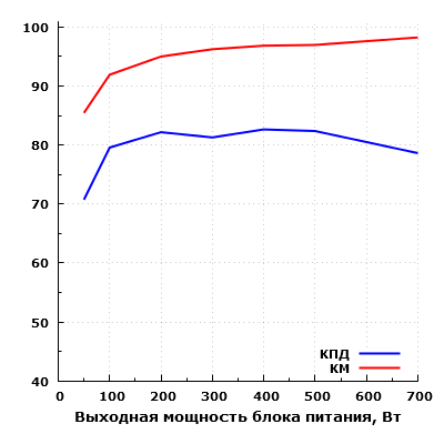 Эффективность БП находится на относительно невысоком уровне. Согласно нашим измерениям, КПД данного блока питания достигает значения свыше 81% в диапазоне мощности от 200 до 500 ватт, максимальное зарегистрированное значение составило 82,7% на мощности 400 Вт. КПД на мощности 50 Вт составил около 71%.