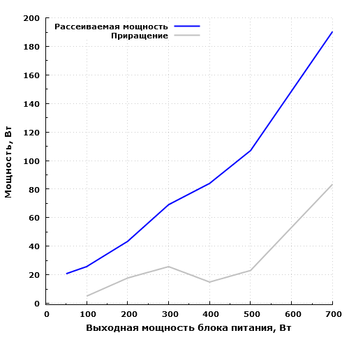 Экономичность у данной модели довольно низкая, особенно на высоких мощностях. На максимальной мощности БП рассеивает около 190 Вт. 60 Вт он рассеивает на мощности около 250 Вт, 100 Вт — на мощности около 470 Вт.