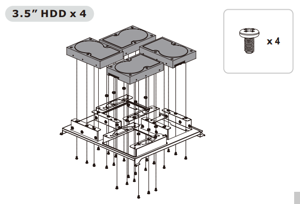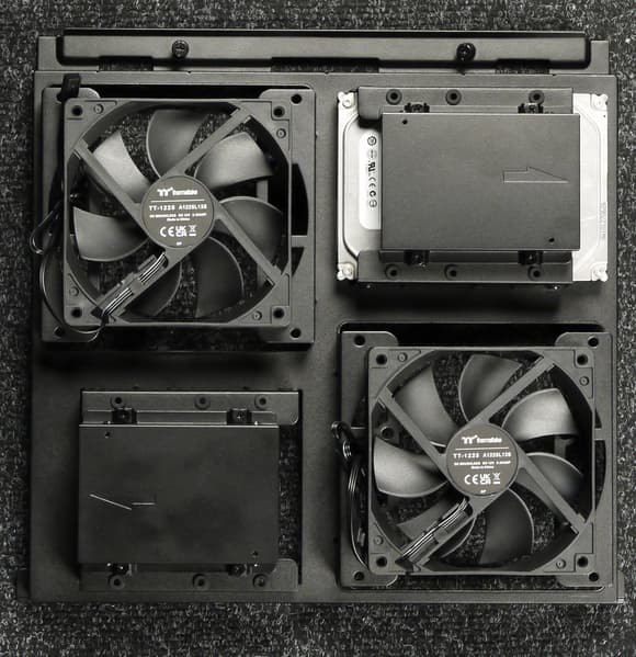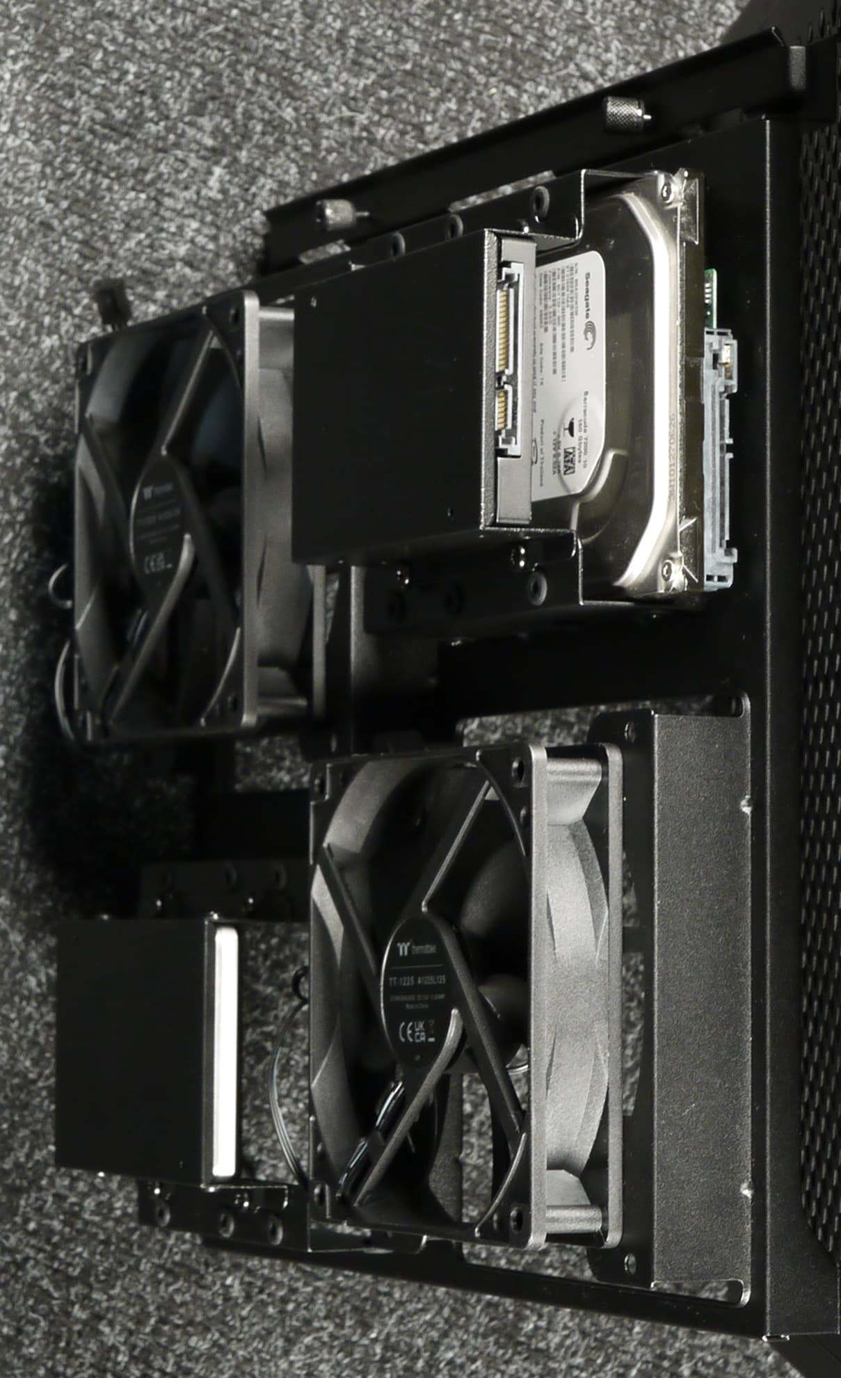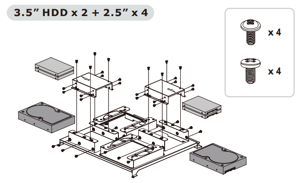 По умолчанию сюда можно установить 2×3,5″ и 4×2,5″. Накопители типоразмера 2,5″ устанавливаются в два съемных отсека, которые в свою очередь прикручены винтами к монтажной пластине. Отсеки для накопителей типоразмера 3,5″ установлены стационарно (отштампованы на самой пластине).