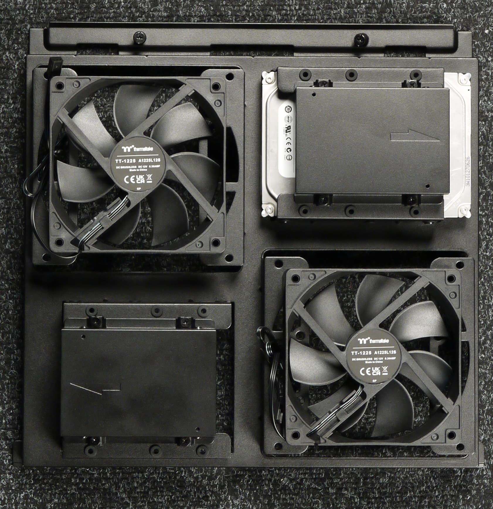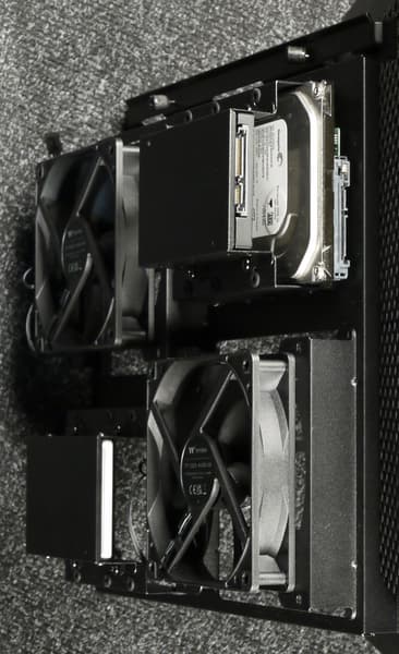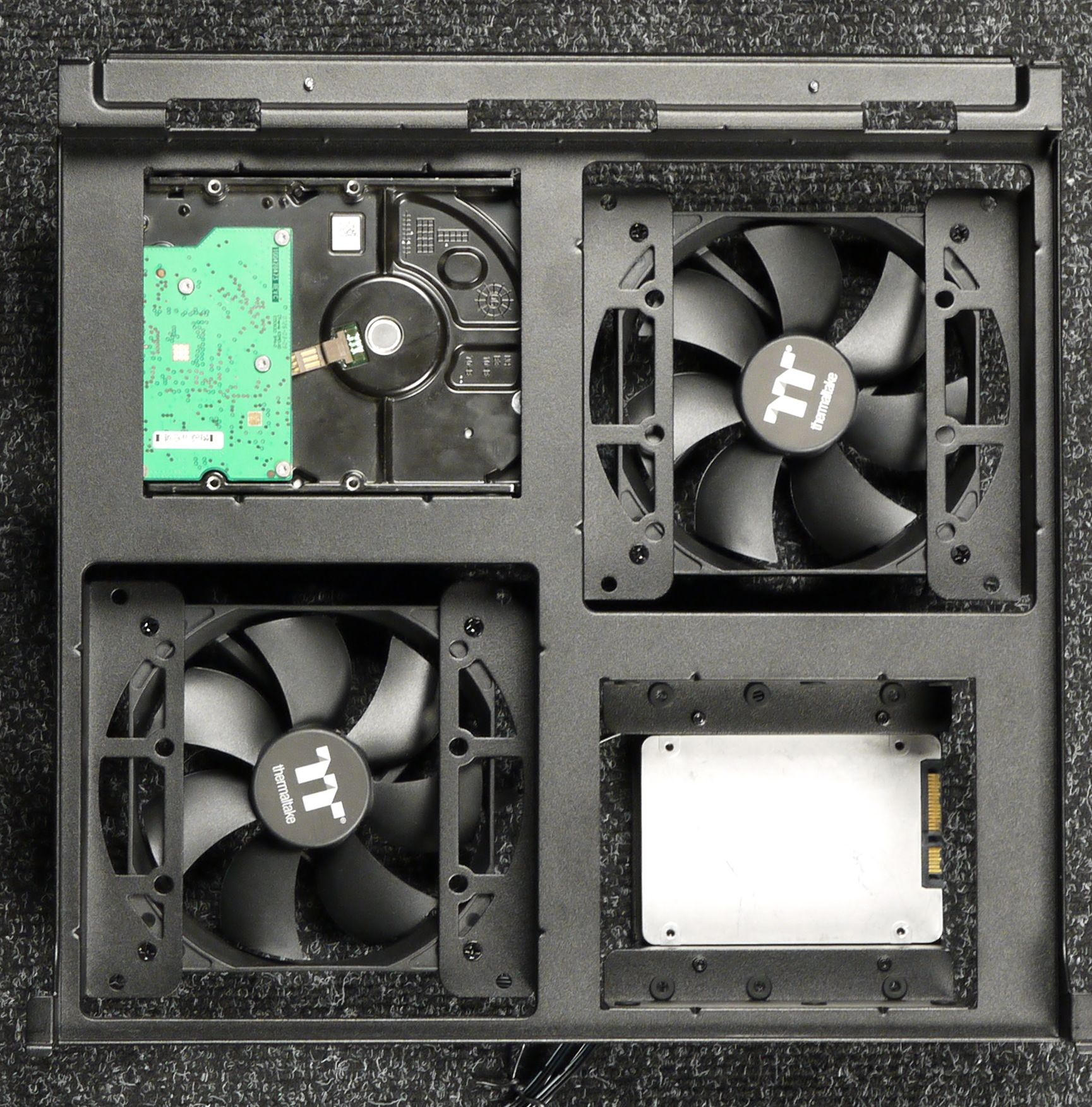 Еще одна зона для установки накопителей расположена на кожухе блока питания. В этом месте предусмотрена установка накопителей при помощи двух съемных монтажных пластин, которые фиксируются в корпусе при помощи гребней и ответных пазов, а также двух винтов под крестовую отвертку, вкручиваемых в верхнюю часть кожуха БП. На каждую из двух пластин можно установить 1×3,5″ или 2×2,5″.