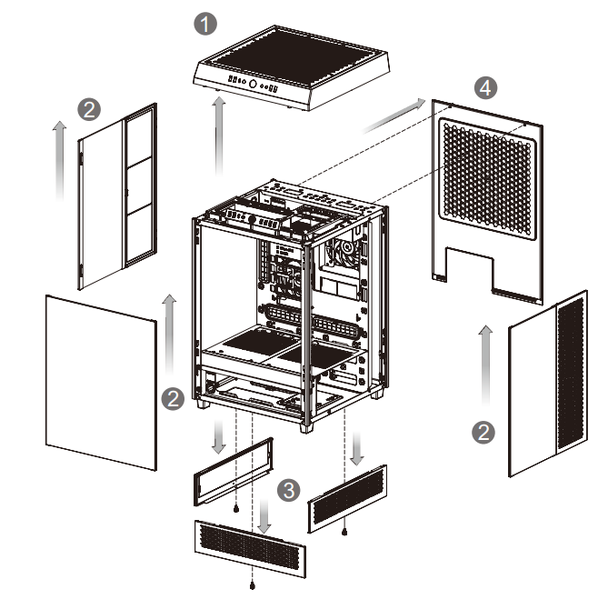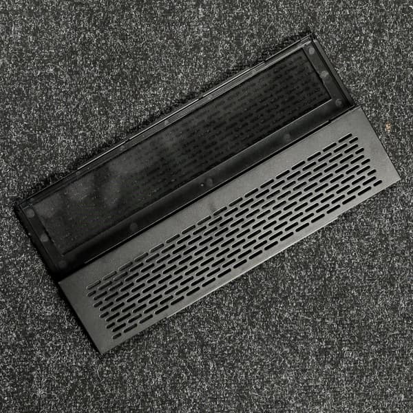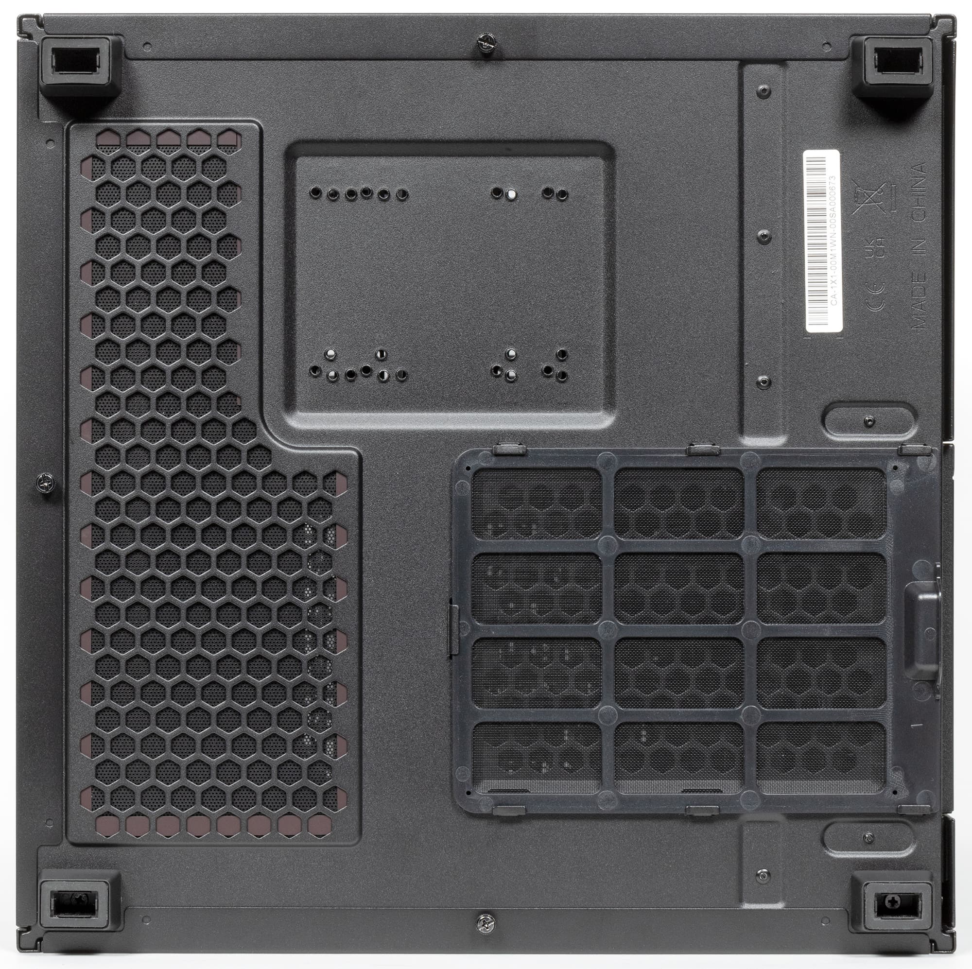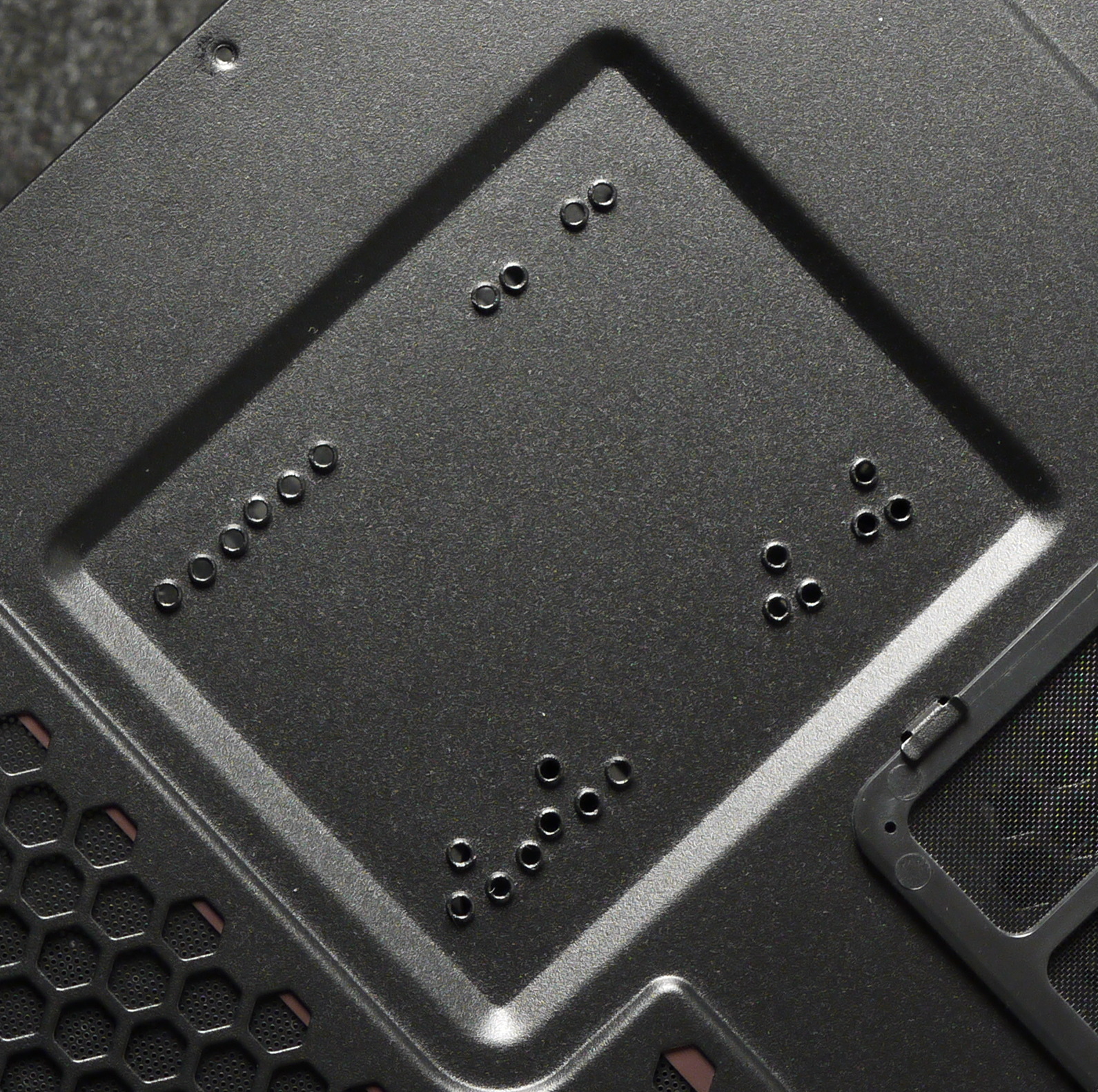 На боковых и передней стенках шасси установлены по две панели: сверху и снизу. Нижняя панель представляет собой штампованную деталь из стали с решеткой посередине, под которой располагается пылевой фильтр.