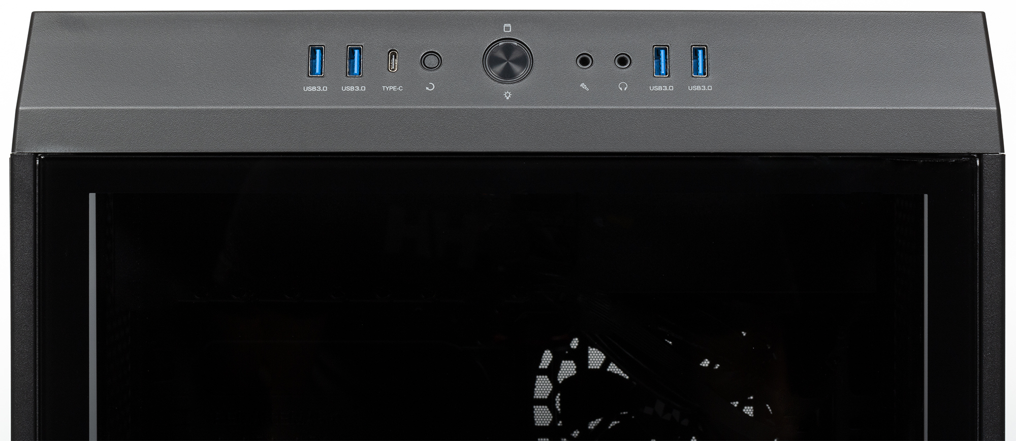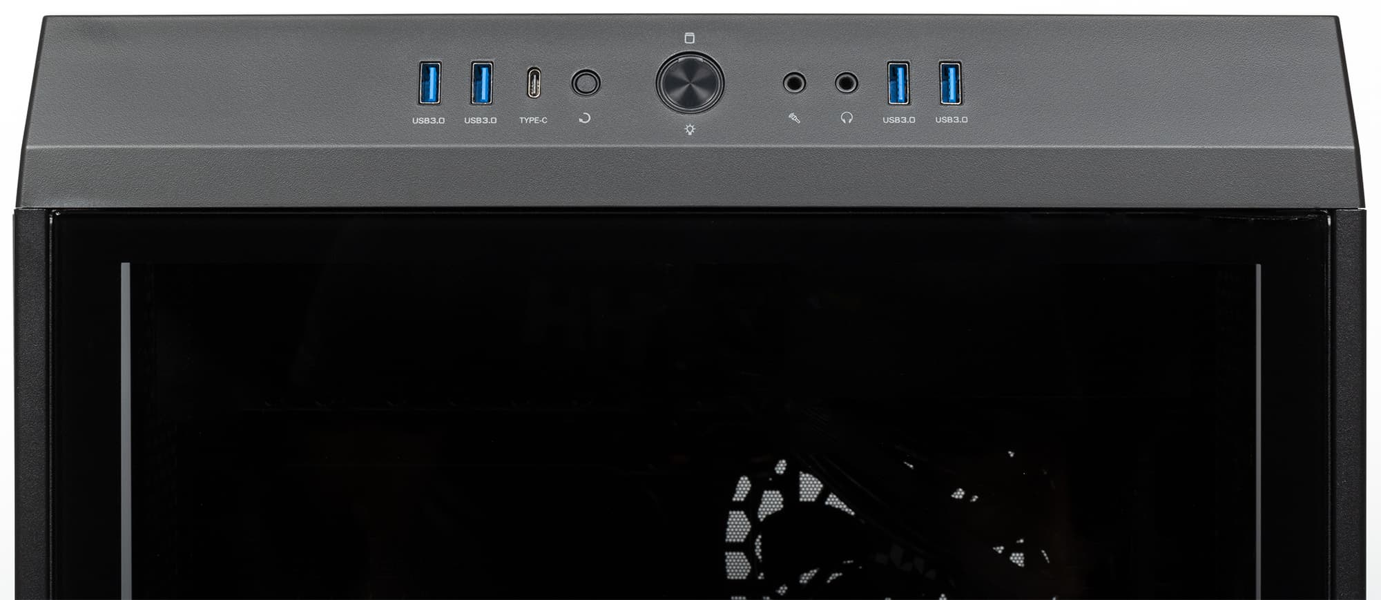 Передняя панель переходит в верхнюю через скошенную площадку (конструктивно это отдельный элемент в пластиковом корпусе, прикрученный к шасси корпуса), на которой размещены кнопки и интерфейсные разъемы: четыре порта USB 3.0, один порт USB3 Gen2 (USB 3.2) Type-C, отдельные разъемы для подключения микрофона и наушников.