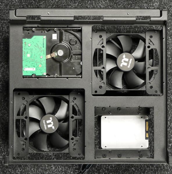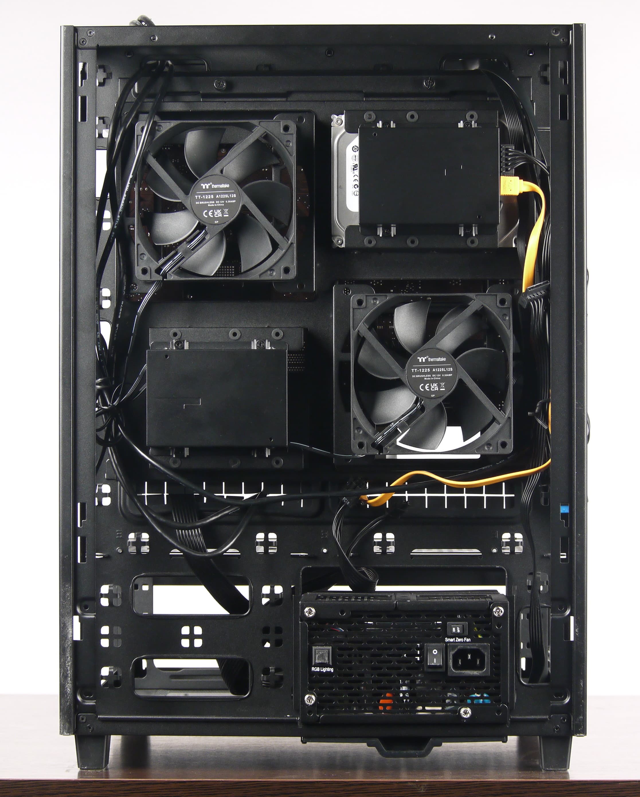 Корпус комплектуется вентиляторами собственного производства Thermaltake. Встроенной подсветки у них нет. Разъем у вентиляторов стандартный трехконтактный с управлением изменением питающего напряжения.