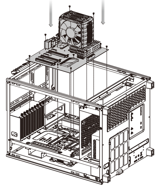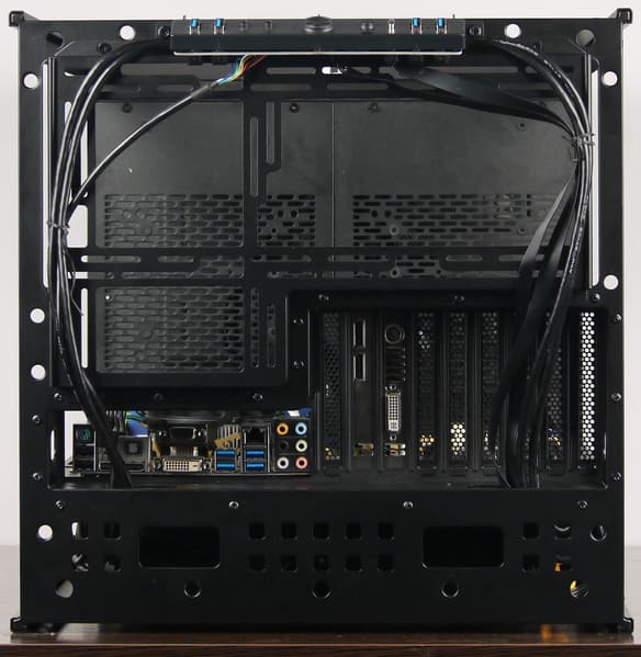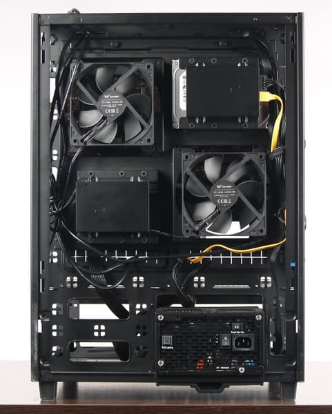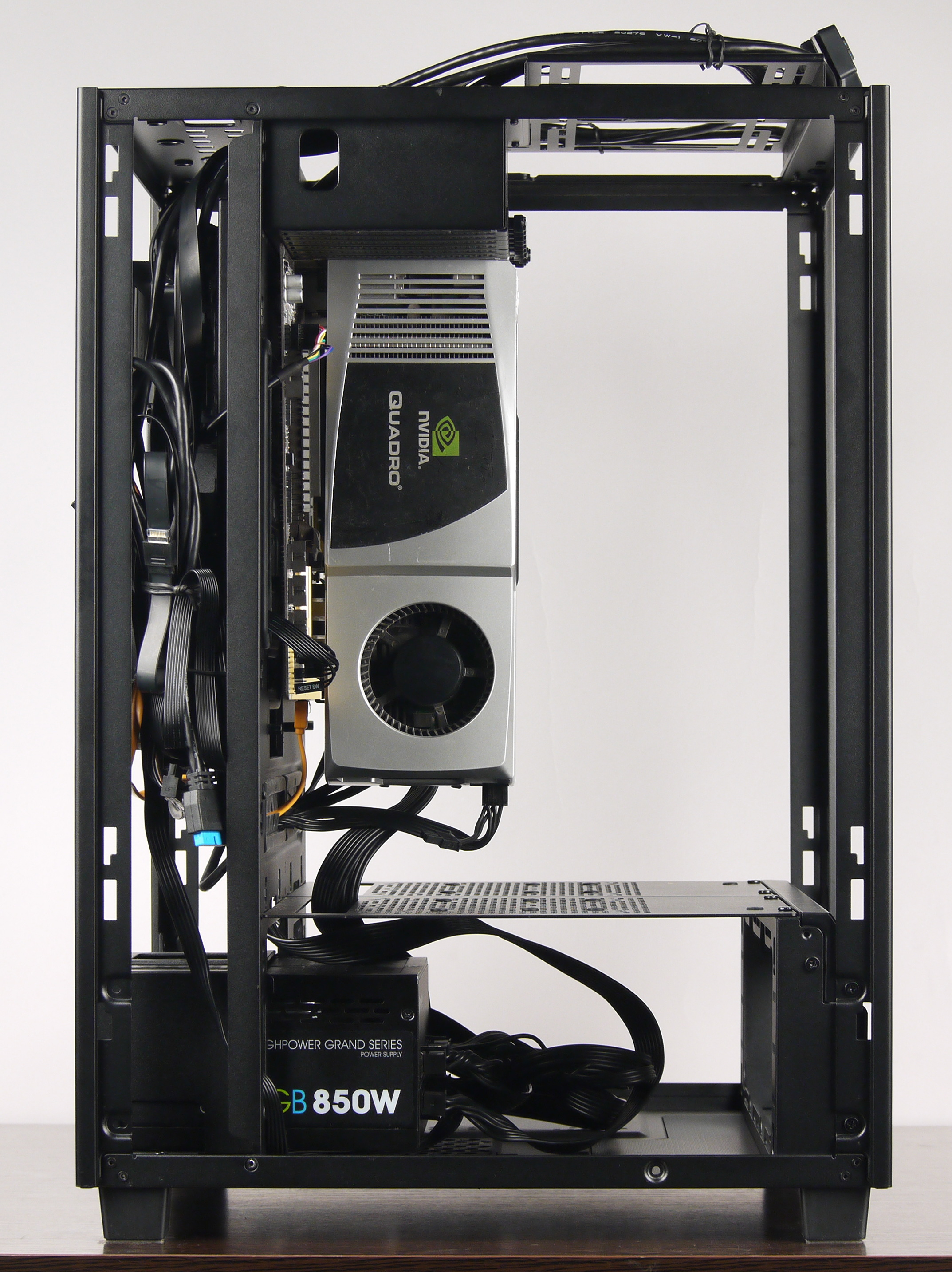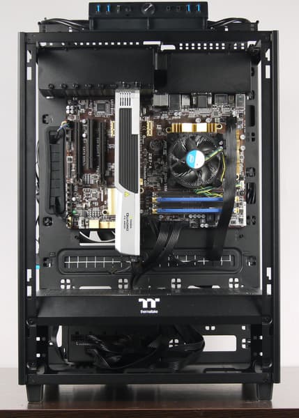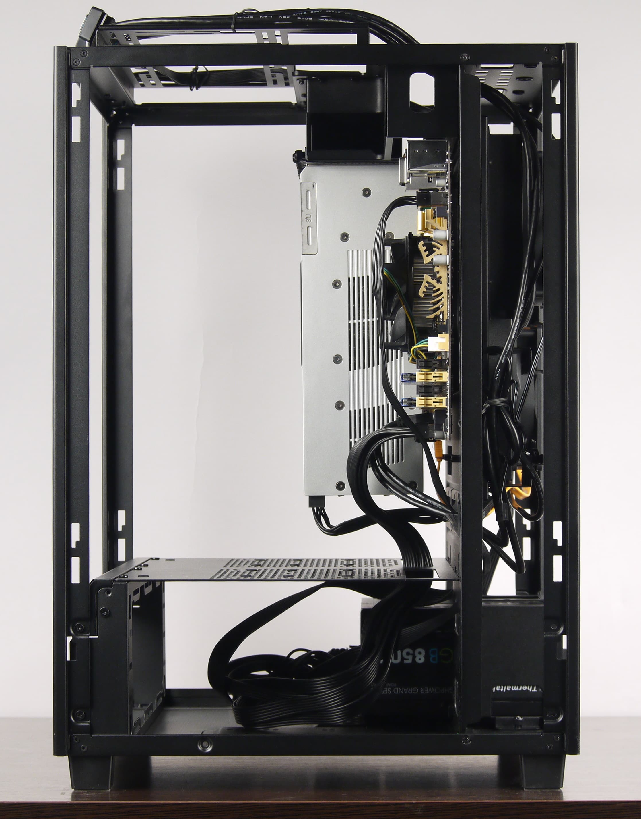 Системная плата размещена внутри вертикально, но повернута на 90 градусов относительно стандартного варианта размещения — портами вверх. Соответственно, все платы расширения, включая и видеокарту, также будут расположены разъемами вверх. Блок питания же расположен вполне стандартно — внизу горизонтально.