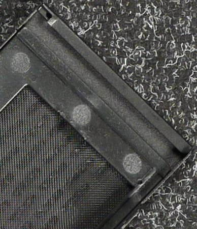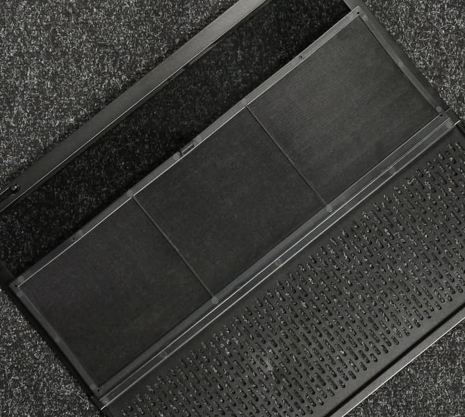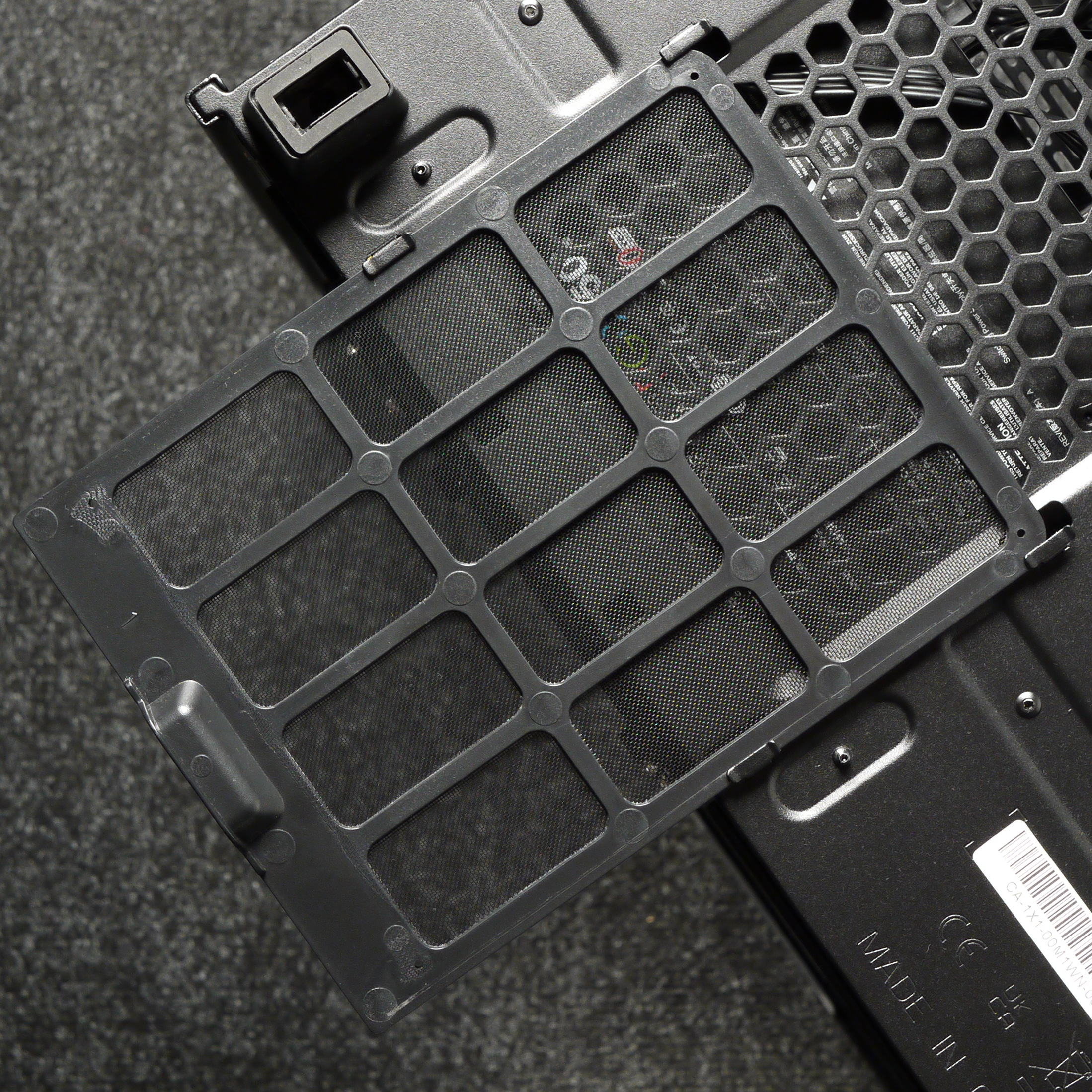 На верхней стенке установлен фильтр из нейлоновой сетки, причем фильтр выполнен быстросъемным, т. е. его можно снять снаружи корпуса, не прибегая к демонтажу каких-то дополнительных элементов конструкции корпуса, также его можно промыть целиком. Смонтирован он на пластиковой рамке, которая удерживается в верхней панели при помощи двух двухпозиционных подпружиненных фиксаторов с одной стороны и двух гребней с ответными пазами с другой стороны. Сверху фильтр закрывает пластиковая решетка. Конструкция достаточно надежная и вполне удобная.