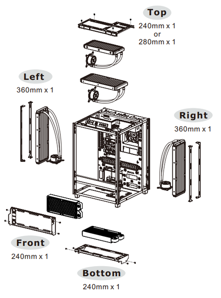 - составная рамка предназначена для установки большого радиатора размером до 399 мм с одной из боковых сторон, это может быть или радиатор системы AIO шириной 120 мм, или радиатор СЖО на дискретных компонентах (на днище корпуса предусмотрено место для установки помпы)