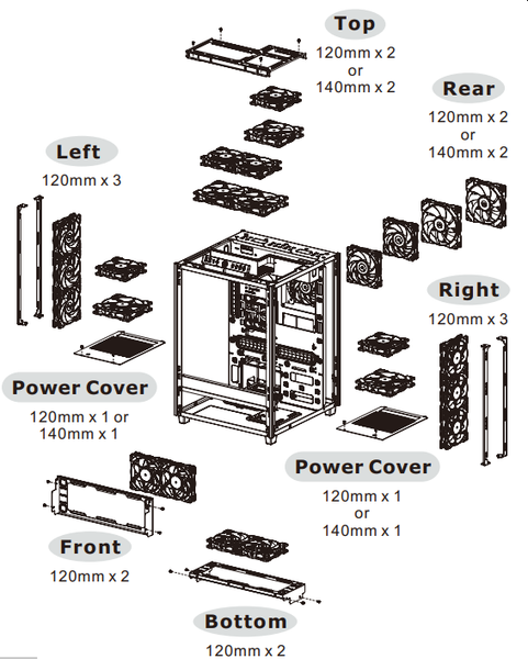 В корпусе предусмотрена возможность установки вентиляторов типоразмера 120 или 140 мм. Установка элементов систем охлаждения реализована посредством монтажных рамок за исключением задних вентиляторов, которые установлены на одной панели с накопителями, и вентиляторов, устанавливаемых на кожух БП (на каждую из съемных панелей можно установить по одному вентилятору 120 или 140 мм).