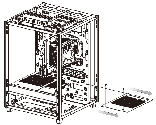 Также нужно снять монтажную панель, расположенную между задней панелью и основанием системной платы. Там располагаются основные места для накопителей.