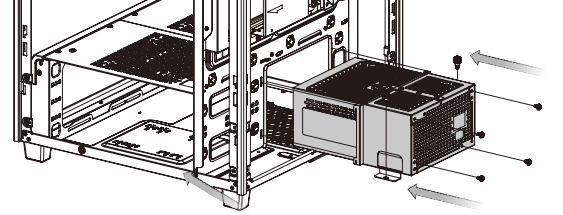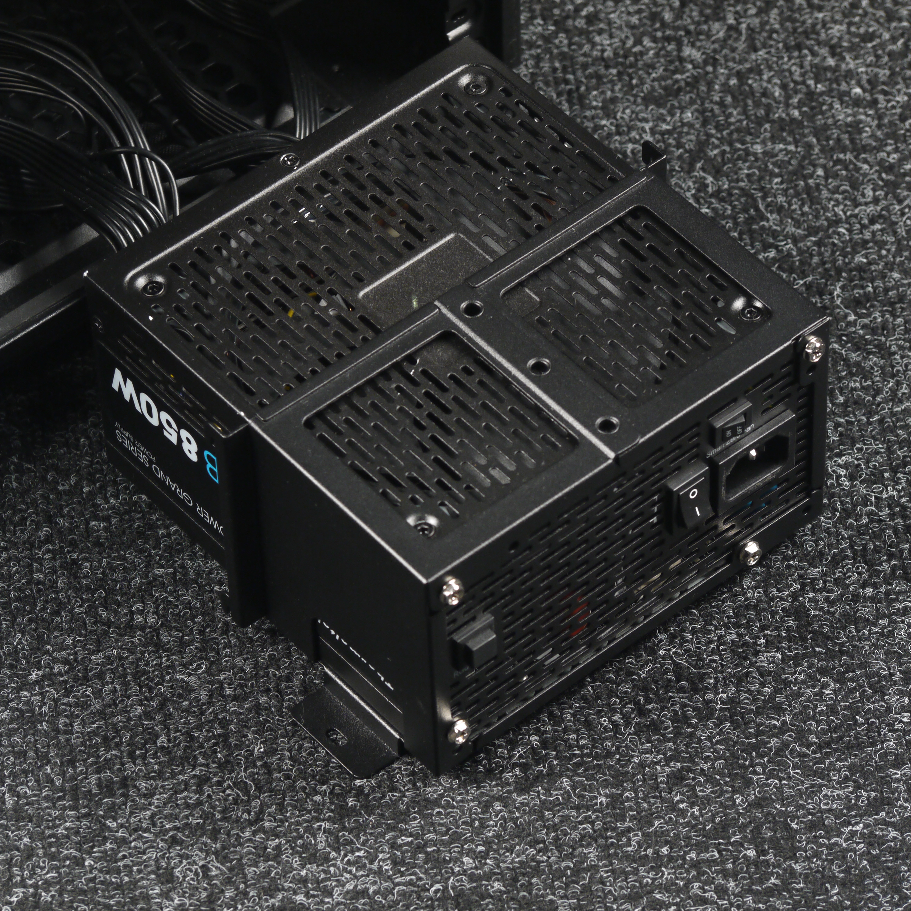 БП формата ATX фиксируется при помощи четырех винтов на монтажной рамке, после чего он заводится в корпус со стороны задней панели. Корпус предусматривает установку блоков питания с длиной корпуса до 200 мм (по заявлению производителя). Мы рекомендуем использовать БП с корпусом длиной не более 180 мм, так как в этом случае останется больше места для укладки неиспользуемых проводов.