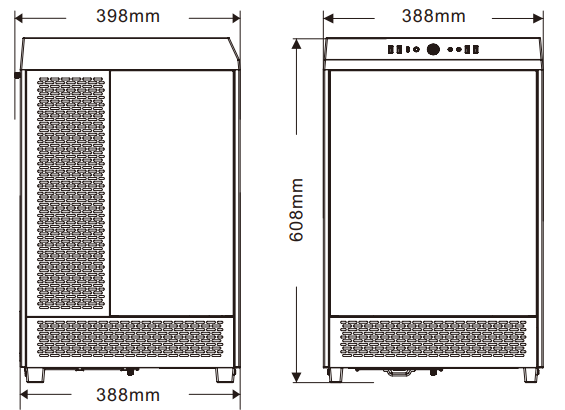 Это истинно башенный корпус: вытянутый вверх параллелепипед с квадратным основанием. Его ширина и глубина составляют 388 мм при высоте 608 мм. Корпус прекрасно сможет разместиться под офисной мебелью высотой 72 сантиметра, при этом останется даже некоторое место для нормальной вентиляции. Порты установлены спереди под углом вверх, что удобно.