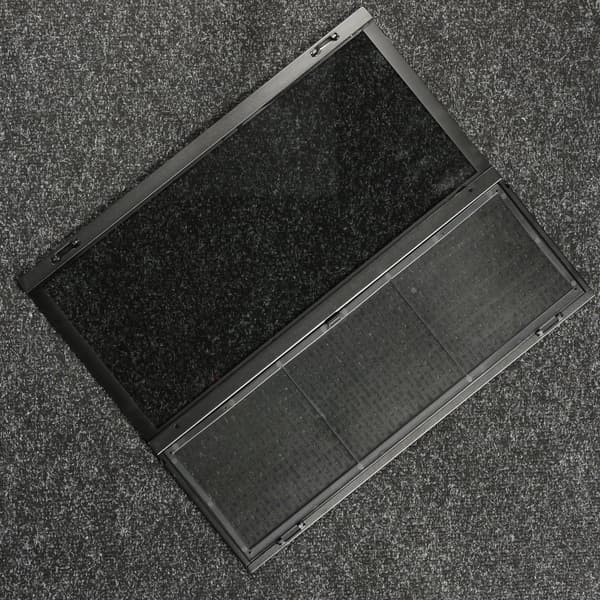 Остальные пять фильтров имеют другую конструкцию. Каждый фильтр выполнен в пластиковой рамке и имеет комбинированное крепление: пластиковая рамка фильтра вставляется одной стороной в паз, который сформирован путем загиба края стальной панели, после чего рамка прислоняется к панели с внутренней стороны и притягивается магнитами.