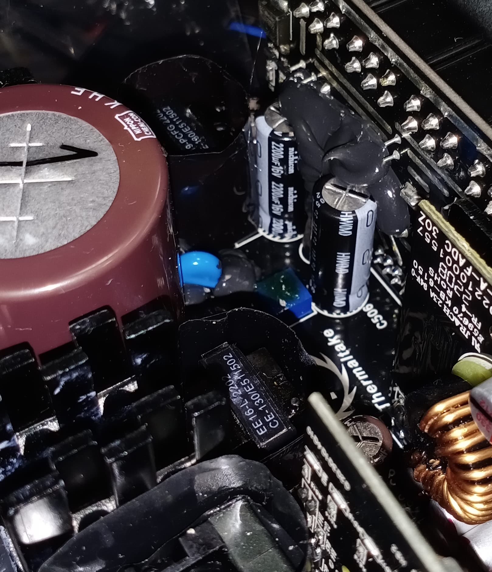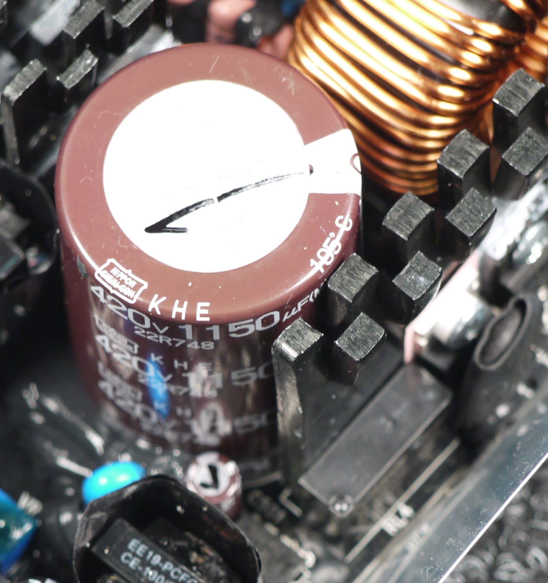 Конденсаторы в блоке питания имеют японское происхождение. В основной массе это продукция под торговыми марками Nippon Chemi-Con, Nichicon и Rubycon. Установлено и большое количество полимерных конденсаторов. Подобная комбинация обычно соответствует устройствам высокого уровня.