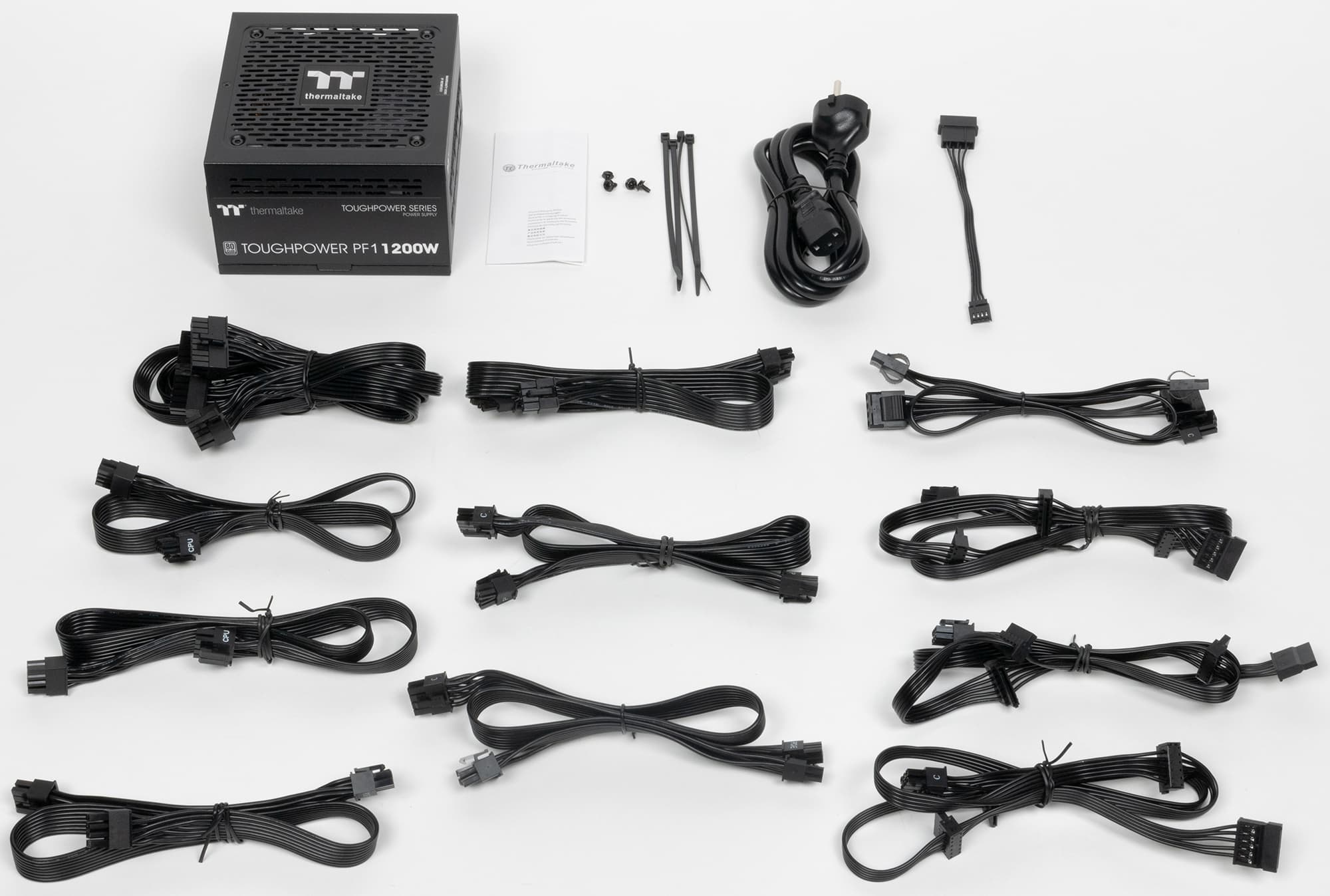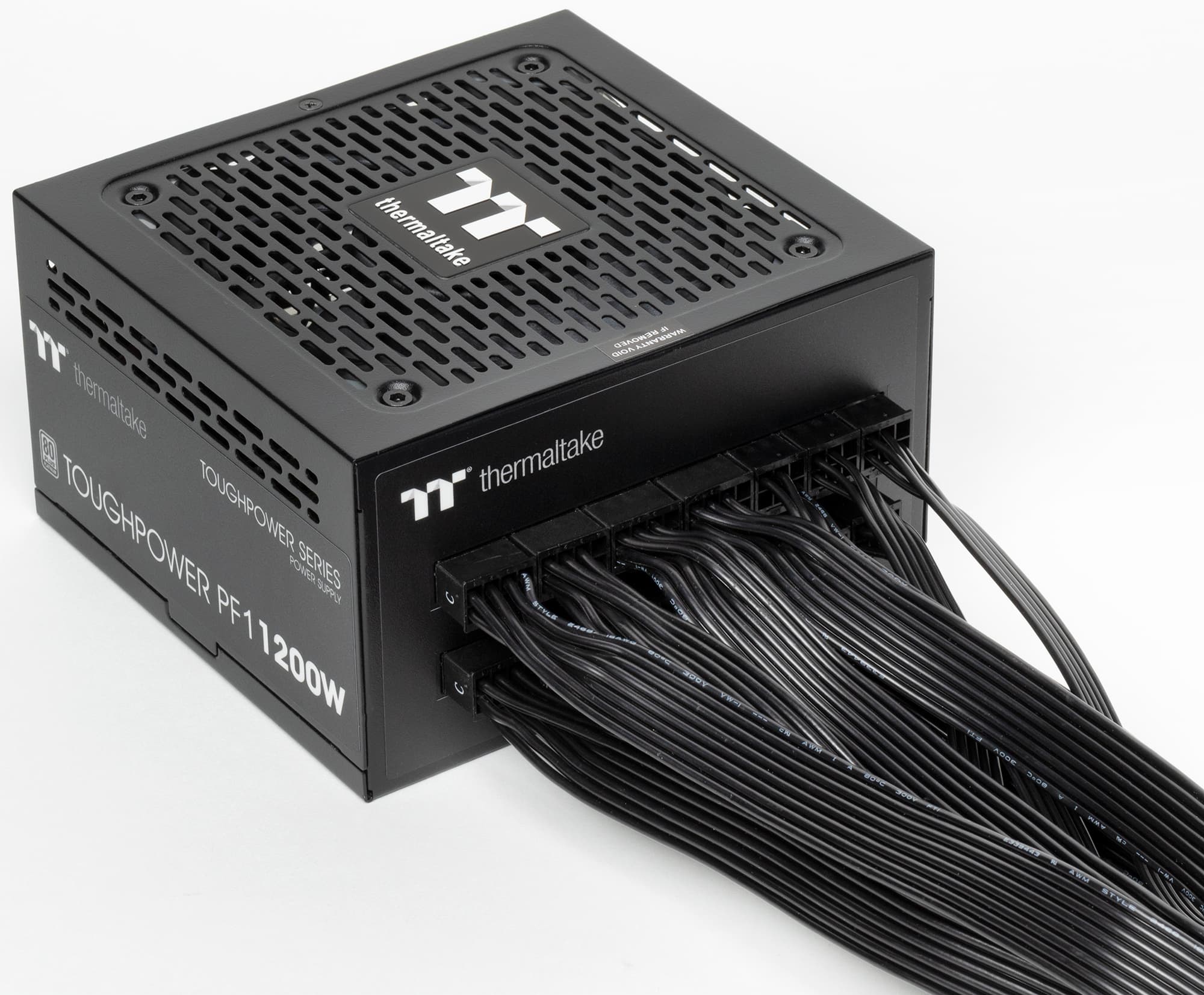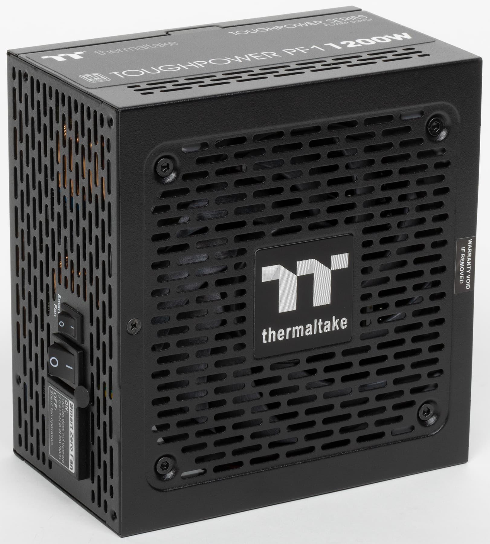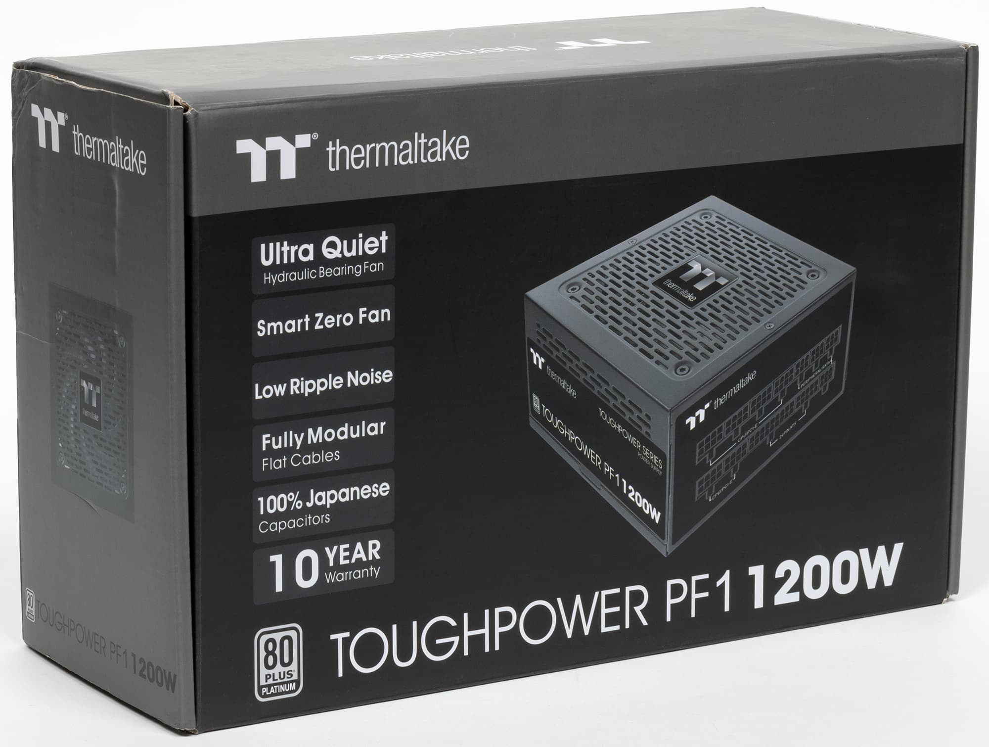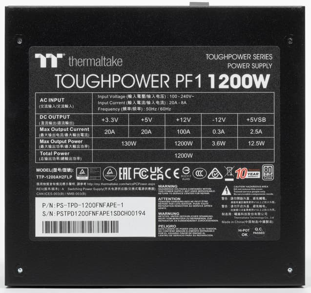 Thermaltake Toughpower PF1 1200W Platinum имеет сертификат 80+ Platinum и укомплектован исключительно японскими конденсаторами. Система охлаждения может работать в двух режимах: в гибридном, когда вентилятор при некоторых условиях не вращается, и в обычном — с постоянно вращающимся вентилятором. Переключаются режимы двухпозиционной клавишей на внешней панели корпуса БП (позиция On соответствует гибридному режиму).