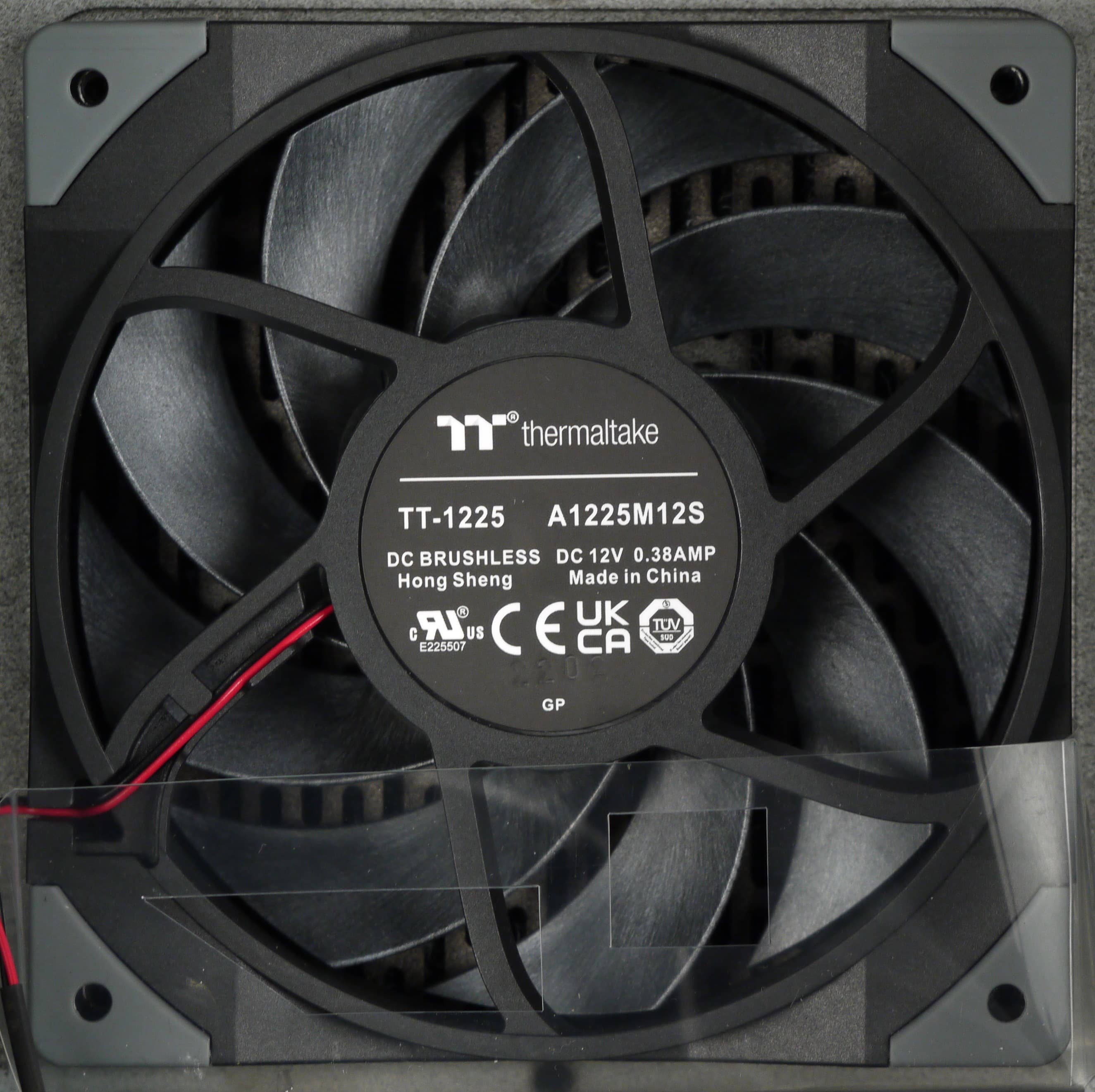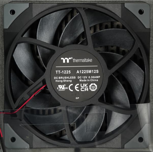 Вентилятор, установленный в блоке питания, брендирован компанией Thermaltake, однако на нем имеется и маркировка изготовителя. В данном случае перед нами продукт производства компании Hong Sheng — A1225M12S. Thermaltake заявляет об использовании гидродинамического подшипника в вентиляторе данного источника питания. Вентилятор типоразмера 120 мм, подключение двухпроводное, через разъем. Использование гидродинамического подшипника подразумевает долгий срок его службы.