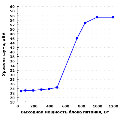 При работе с постоянно вращающимся вентилятором шум блока питания в диапазоне мощности до 300 Вт включительно находится на уровне около 23 дБА с расстояния 0,35 метра. Подобный уровень шума можно считать минимально заметным. При работе на мощности от 300 до 500 Вт шум блока питания находится на уровне менее 25 дБА с расстояния 0,35 метра. Подобный уровень шума можно считать действительно низким.