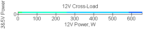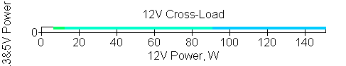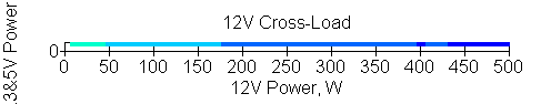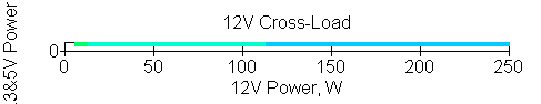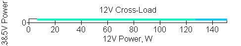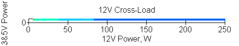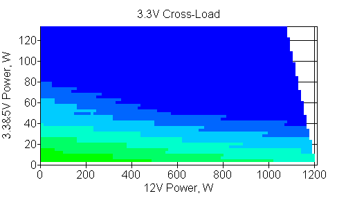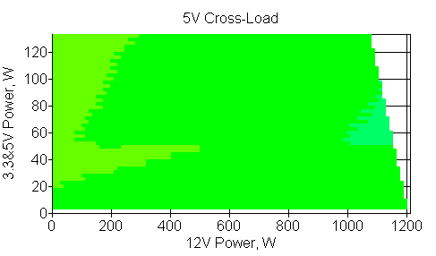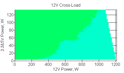 Следующим этапом инструментального тестирования является построение кросснагрузочной характеристики (КНХ) и представление ее на четвертьплоскости, ограниченной максимальной мощностью по шине 3,3&5 В с одной стороны (по оси ординат) и максимальной мощностью по шине 12 В с другой (по оси абсцисс). В каждой точке измеренное значение напряжения обозначается цветовым маркером в зависимости от отклонения от номинального значения.