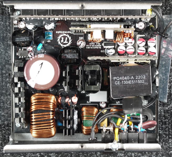 Конструкция блока питания вполне соответствует современным тенденциям: активный корректор коэффициента мощности, синхронный выпрямитель для канала +12VDC, независимые импульсные преобразователи постоянного тока для линий +3.3VDC и +5VDC.