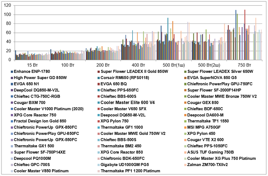 | Super Flower Leadex Silver 650W | 10,9 | 15,1 | 22,8 | 45 | 62,5 | 59,2 | |