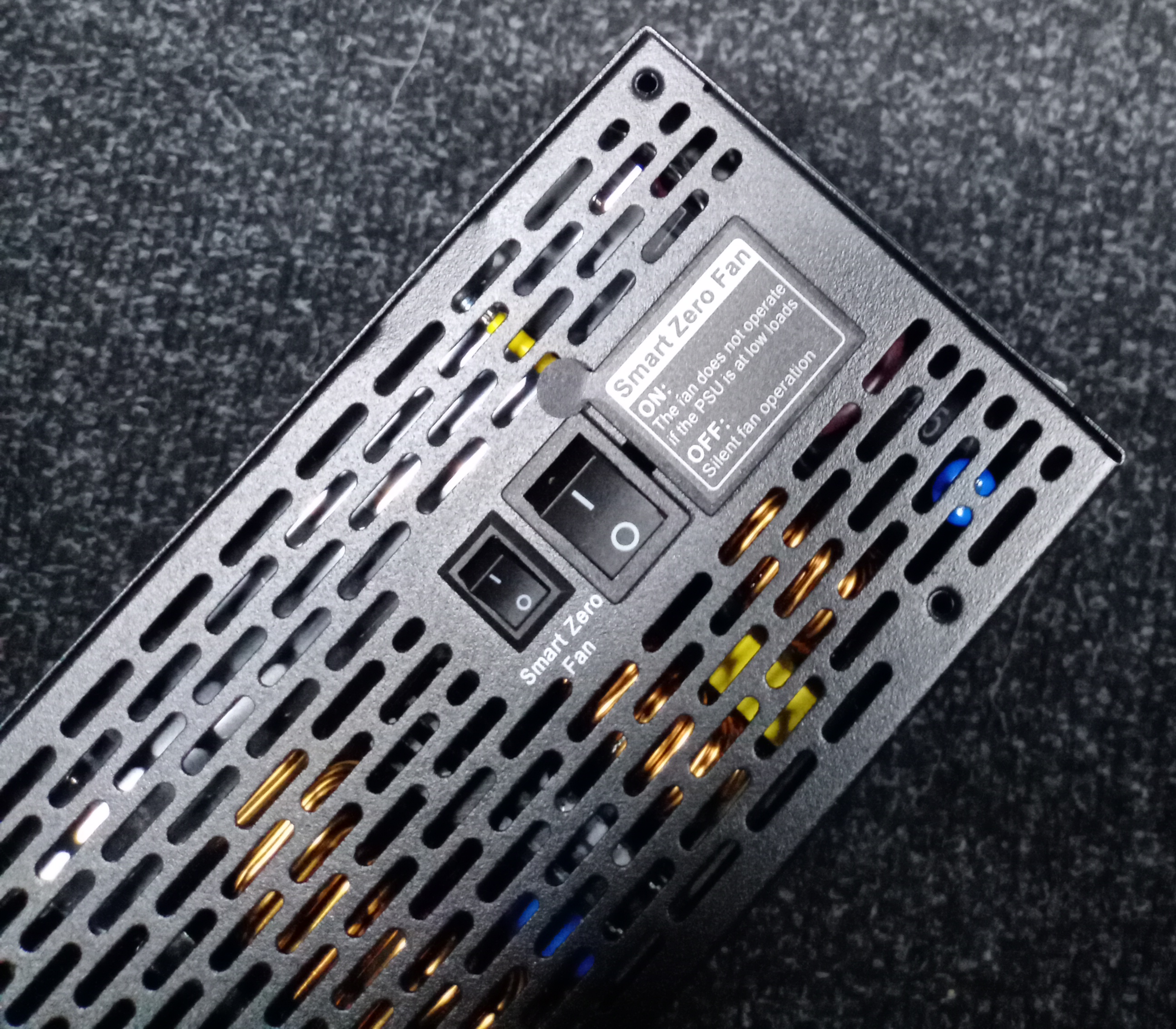 Данная модель имеет гибридную систему охлаждения, что означает возможность функционирования БП не только при активном, но и при пассивном охлаждении. Управление запуском вентилятора производится в зависимости от достижения температуры на встроенном термодатчике. При работе в гибридном режиме на мощности до 50 Вт включительно работу блока питания можно считать условно бесшумной, так как вентилятор в обычных условиях не вращается в течение продолжительного времени.