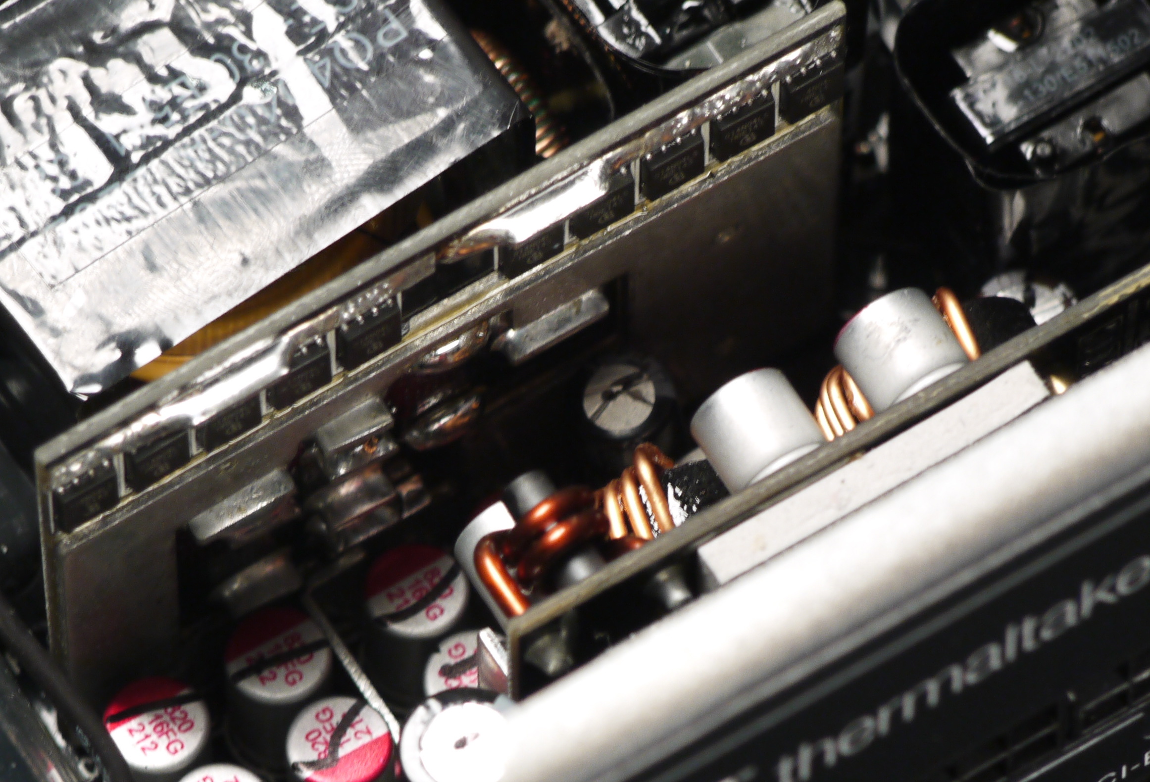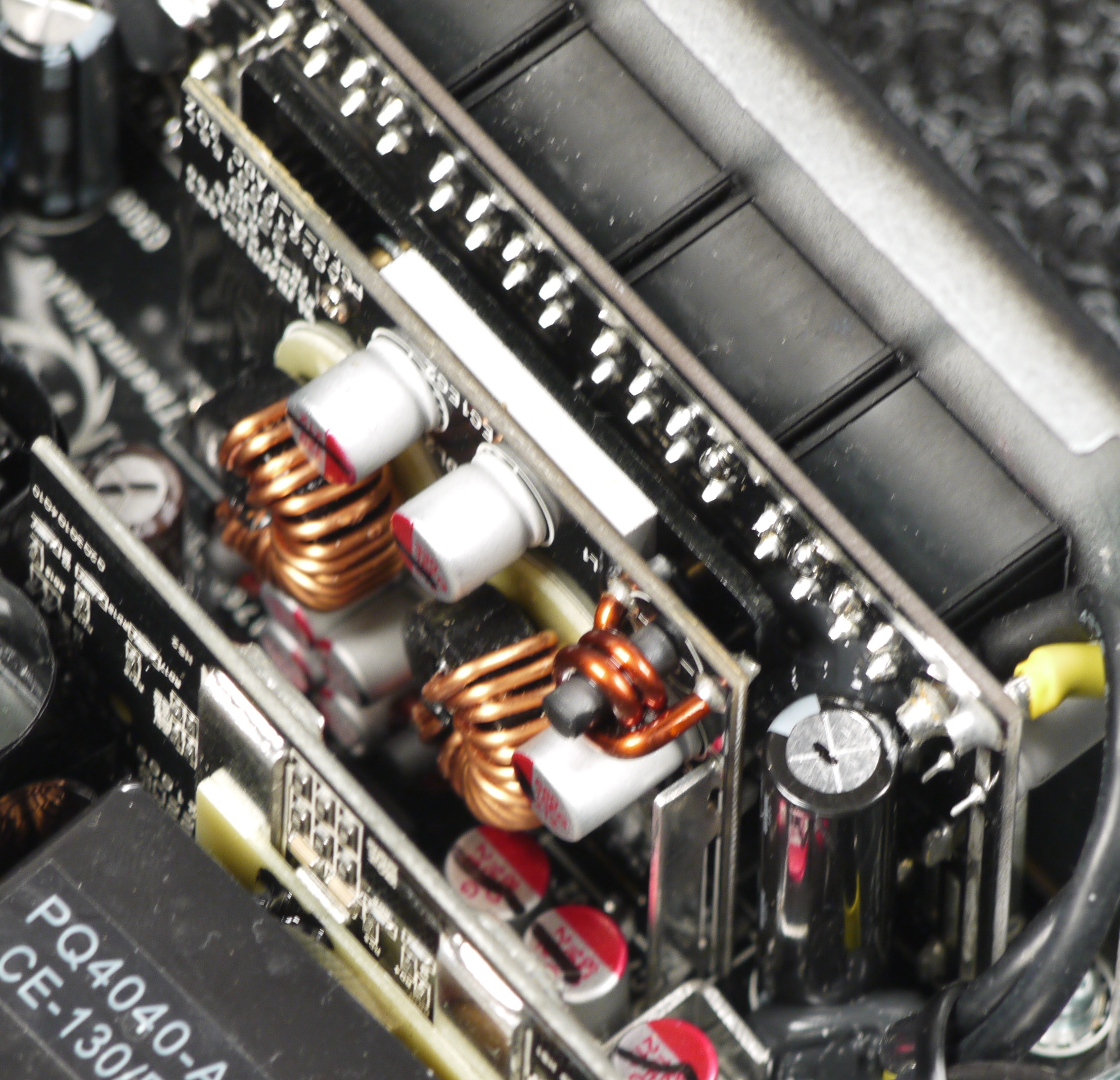 Элементы синхронного выпрямителя размещены на дочерней плате, там же есть небольшие теплорассеивающие элементы в виде тонких пластин. Плата синхронного выпрямителя установлена вертикально, что улучшает охлаждение по сравнению с вариантом размещения элементов синхронного выпрямителя на основной плате методом поверхностного монтажа.