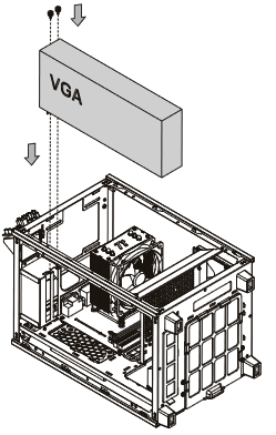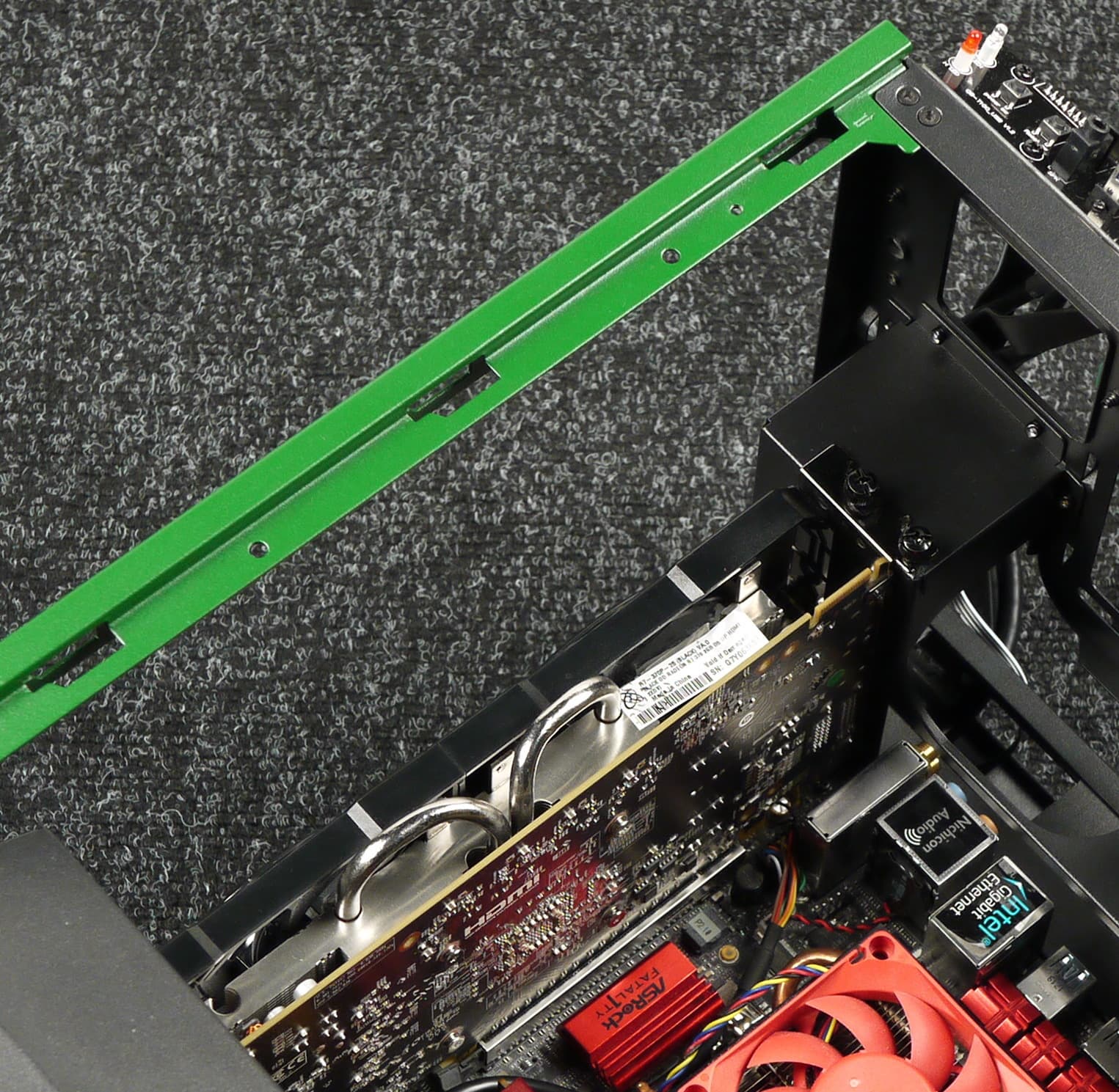 Толщина видеокарты не регламентирована, практическое расстояние между платой и шасси корпуса составляет около 65 мм, так что сюда можно установить видеокарты с нестандартной толщиной менее трех слотов, то есть менее 66 мм.