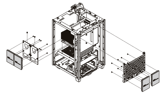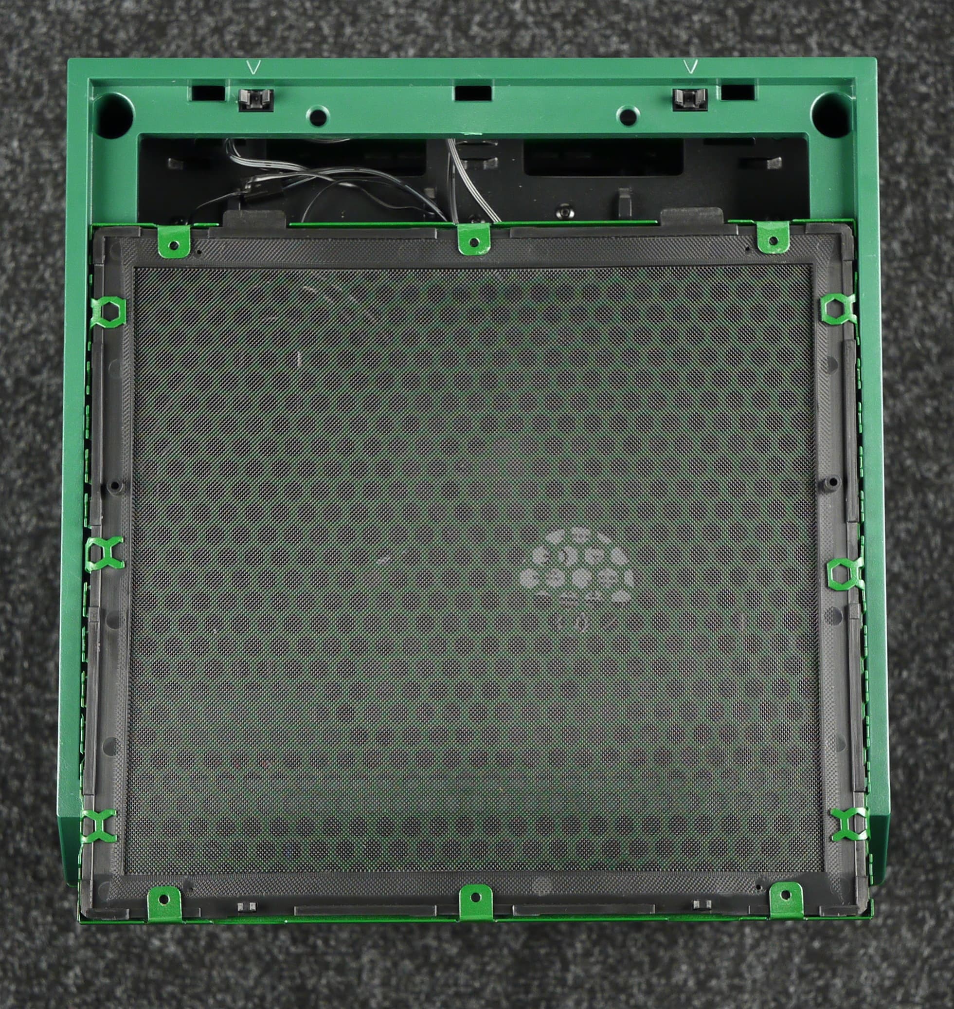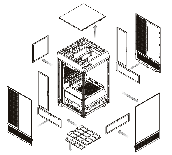 На боковых и передней стенках шасси установлены по две панели: сверху и снизу. Нижняя панель представляет собой штампованную деталь из стали с решеткой посередине, под которой располагается пылевой фильтр.