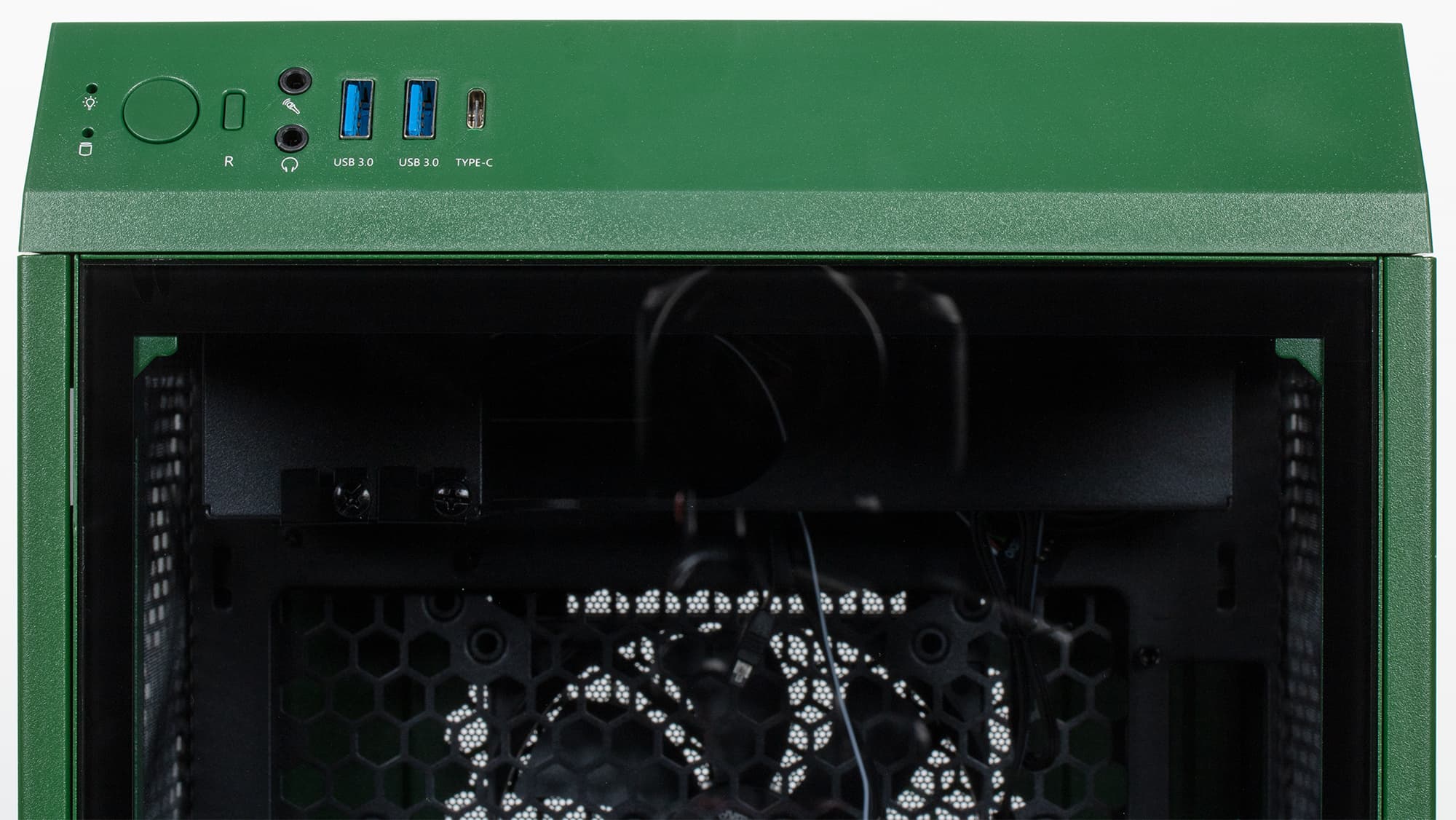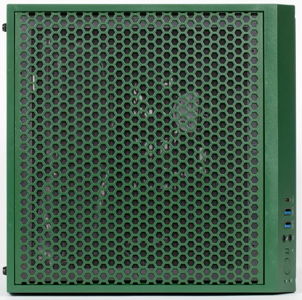 Передняя панель переходит в верхнюю через скошенную площадку (конструкционно это верхняя панель), на которой размещены кнопки и интерфейсные разъемы: два порта USB 3.0, один порт USB 3 Gen 2 (USB 3.1) Type-C, отдельные разъемы для подключения микрофона и наушников. Таким образом, корпус позволяет подключать проводные гарнитуры как с цифровым, так и с аналоговым интерфейсом со стороны передней панели. Но разъемов USB все-таки хотелось бы видеть чуть больше, двух разъемов (типа A) не всегда достаточно для оперативного подключения периферийного оборудования.
