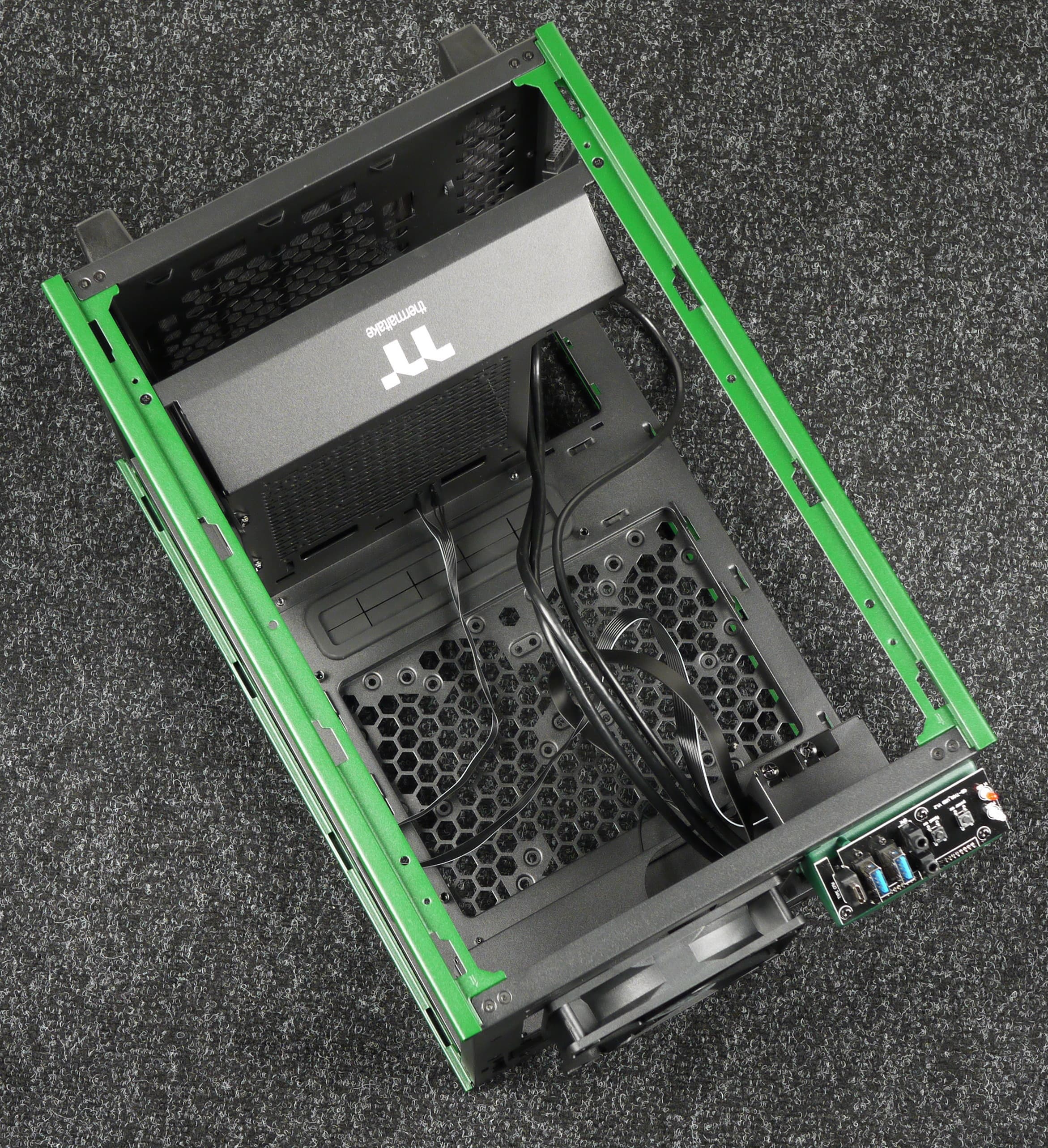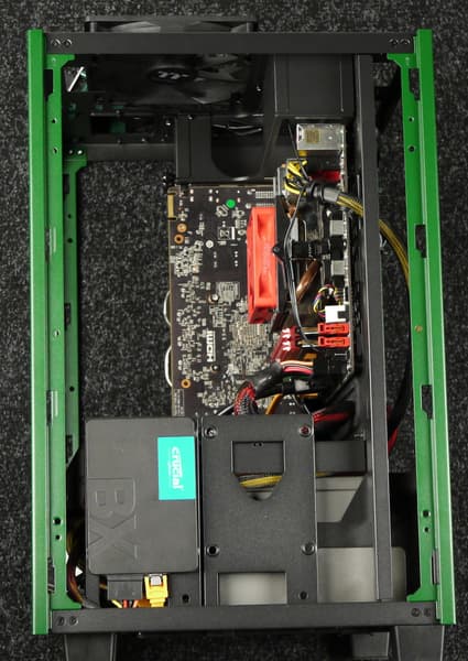 Системная плата установлена вертикально, но повернута на 90 градусов относительно стандартного варианта размещения так, что смотрит портами вверх. Соответственно, все платы расширения, включая и видеокарту, также будут расположены портами вверх. Блок питания устанавливается вполне стандартно — внизу горизонтально.