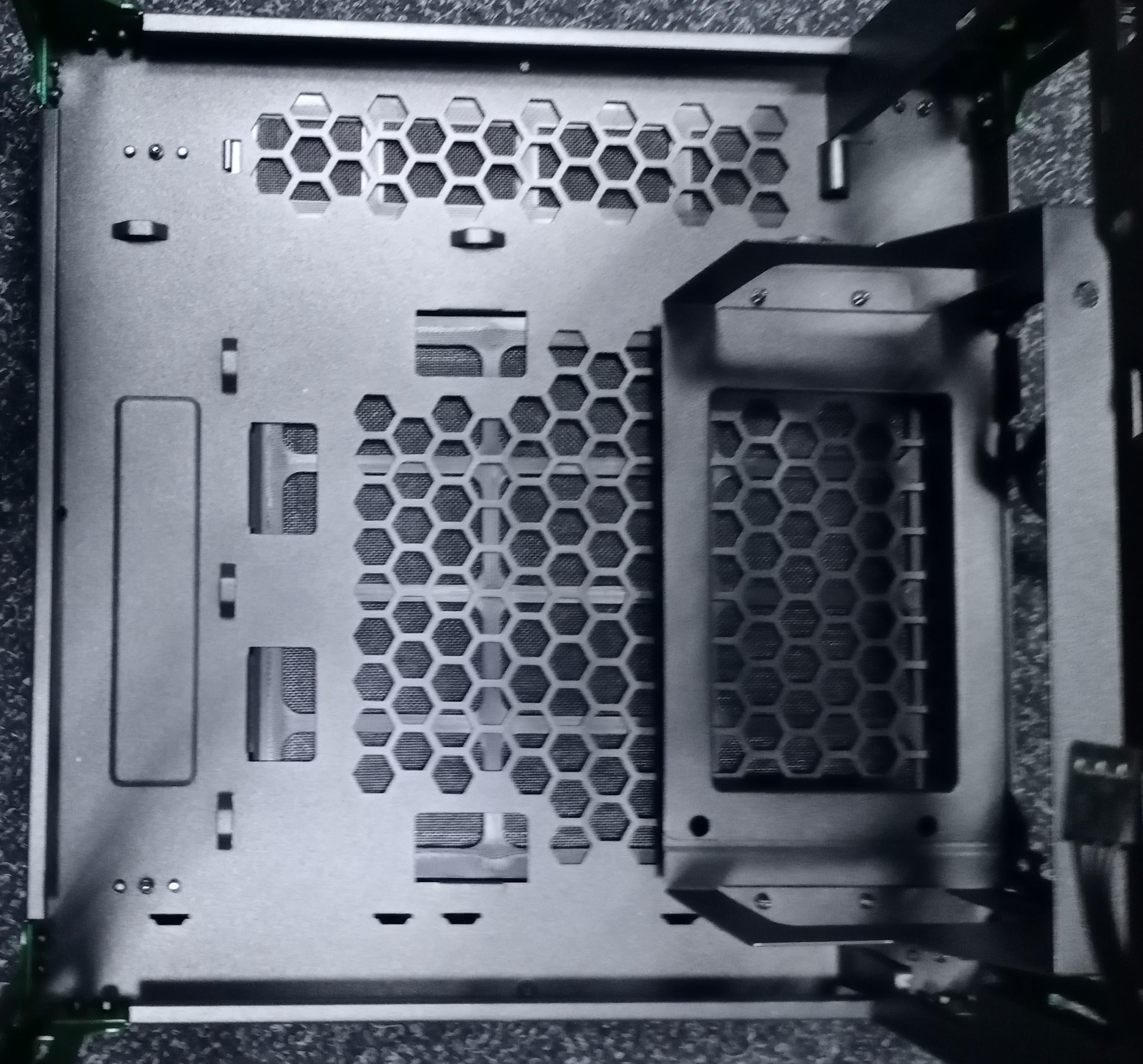 Кожух частично закрывает место установки блока питания, придавая внутреннему виду корпуса аккуратность и законченность. Именно это и является его основной функцией — прятать блок питания с проводами. Кожух не полноразмерный, а также на нем присутствует большое количество вентиляционных отверстий.