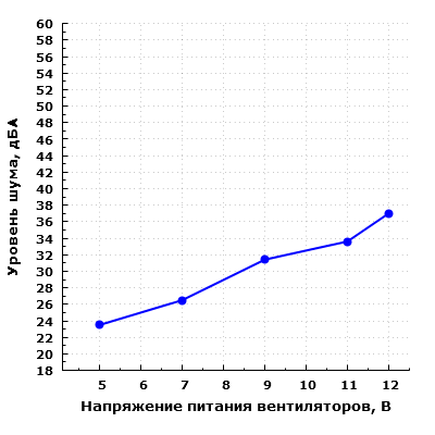 Уровень шума системы охлаждения изменяется от 23,5 до 37 дБА при расположении микрофона в ближнем поле. При питании вентиляторов напряжением 5 В шум находится на низком уровне, однако с ростом напряжения питания уровень шума возрастает. В типовом диапазоне регулирования напряжения 7—11 В шум изменяется от пониженного (26,5 дБА) до среднетипичного (33,7 дБА) уровня относительно типичных значений для жилых помещений в дневное время суток.